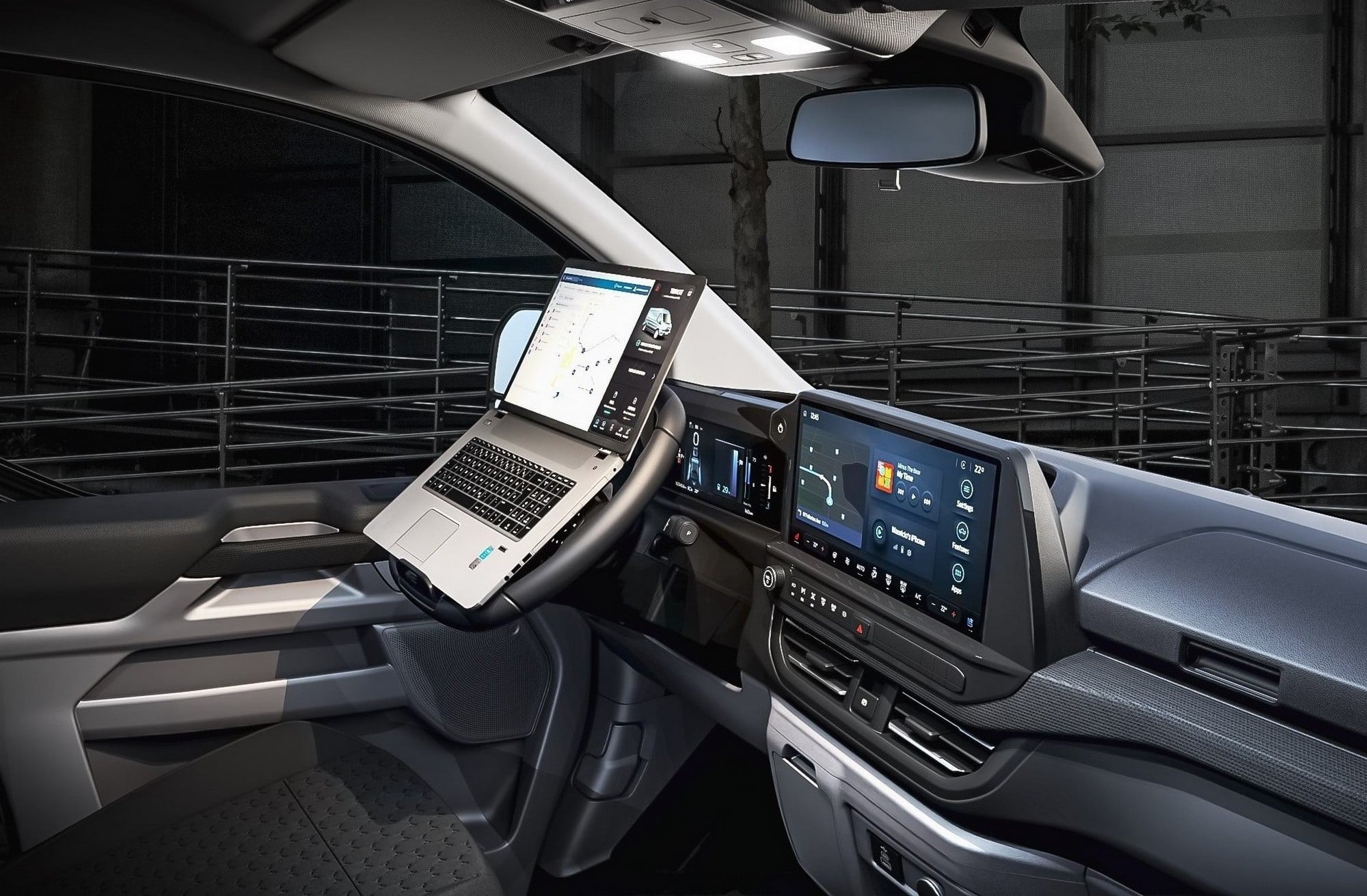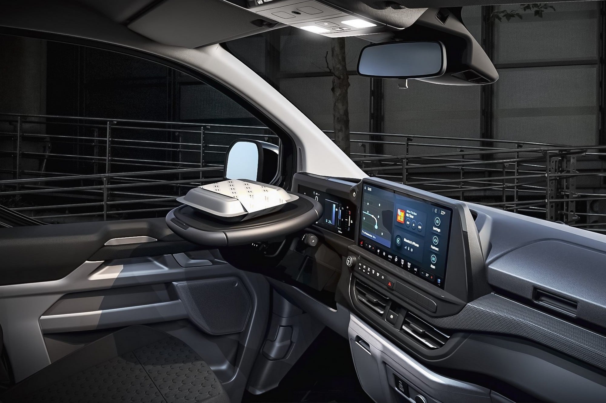 Οι καινοτομίες οι οποίες διαθέτει το νέο E-Transit Custom της Ford Pro έχουν σχεδιαστεί για να κάνουν την καμπίνα πιο παραγωγική και άνετη περιλαμβάνοντας το προαιρετικό Mobile Office με ανακλινόμενο τιμόνι και την τεχνολογία εξοικονόμησης χρόνου Delivery Assist. Σημαντική είναι επίσης η νέα θέση των εμπρός τροχών και των άνω βάσεων των γονάτων της ανάρτησης που εξασφαλίζει βελτιωμένους χώρους και πρόσβαση στην καμπίνα του οχήματος, καθώς και ο εγκατεστημένος στην οροφή αερόσακος οδηγού για τη δημιουργία ενός ιδιαίτερα πρακτικού  αποθηκευτικού χώρου στο ταμπλό, ικανού να χωρέσει ένα laptop ή ένα ντοσιέ μεγέθους Α4.