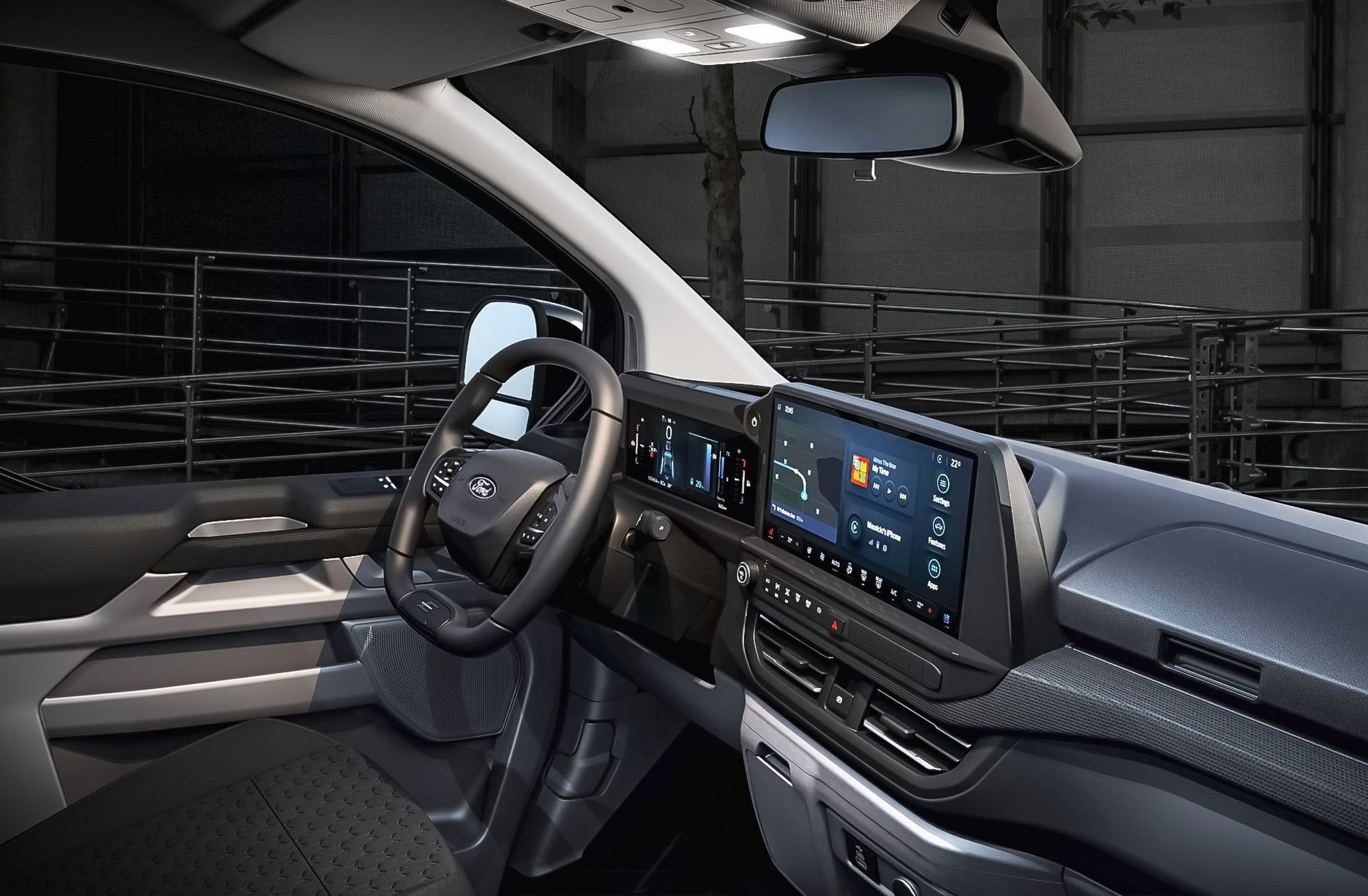Με προηγμένες ψηφιακές εμπειρίες και λογισμικό Όλα τα E-Transit Custom και Transit Custom PHEV είναι εξοπλισμένα με οθόνη αφής 13 ιντσών με κλίση προς τον οδηγό και οριζόντια διάταξη. Αυτή υποστηρίζει το σύστημα επικοινωνίας και ψυχαγωγίας SYNC 4 της Ford που λειτουργεί μέσω 5G μόντεμ εξασφαλίζοντας απρόσκοπτη συνδεσιμότητα με την προηγμένη στοίβα τεχνολογίας της εταιρείας. Περαιτέρω παραγωγικότητα κατά τη διάρκεια της οδήγησης εξασφαλίζεται από το Alexa Built-in, το οποίο επιτρέπει στους οδηγούς να χρησιμοποιούν απλές φωνητικές εντολές προκειμένου να πραγματοποιούν κλήσεις και αγορές απευθείας μέσω του Amazon.com.
