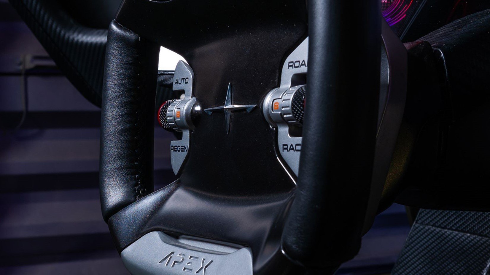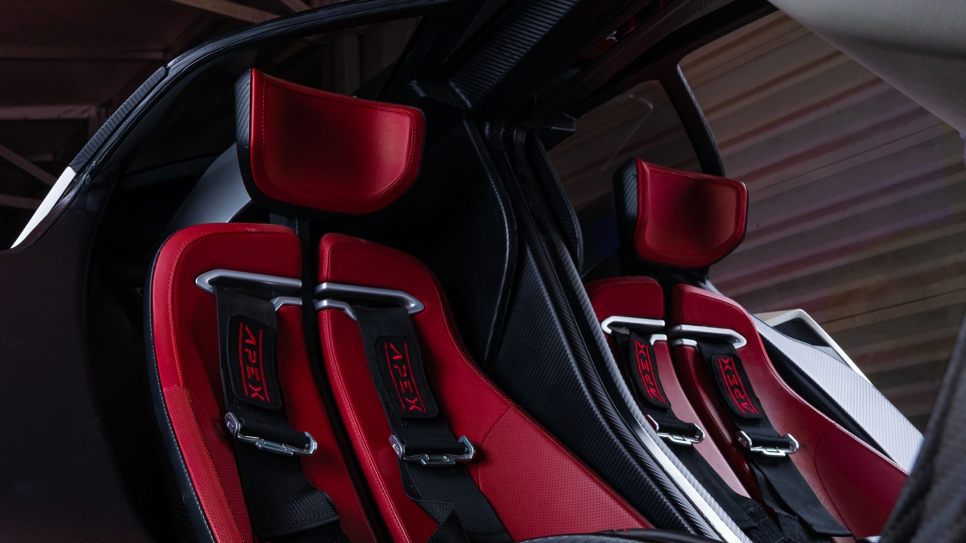 Ανάλογα εντυπωσιακή είναι και η εικόνα στο αυστηρά διθέσιο εσωτερικό του Apex AP-0, θυμίζοντας ταινία επιστημονικής φαντασίας. Φυσικά, ο πίνακας οργάνων είναι εξ ολοκλήρου ψηφιακός και χωρισμένος σε τρία τμήματα. Μάλιστα, στην καμπίνα υπάρχουν διακοσμητικά από ανθρακόνημα και αλουμίνιο σε ένα μεγάλο μέρος της. Παράλληλα, τα bucket καθίσματα είναι εκεί για να στηρίζουν τους επιβαίνοντες, όταν το AP-0 είναι σε… fast forward.