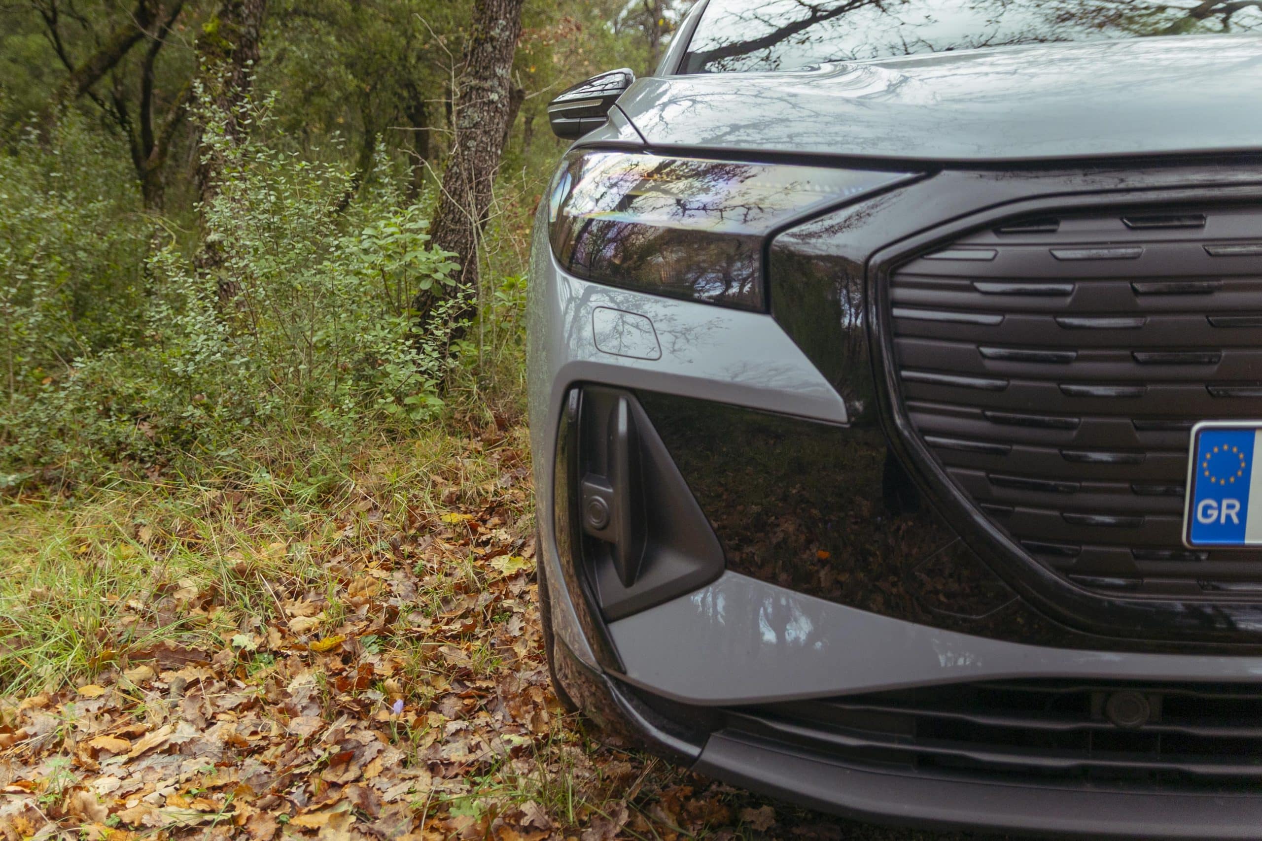 Η εξωτερική εμφάνιση του Audi Q4 Sportback θα μπορούσε να αποτελεί ένα σεμινάριο σύγχρονης βιομηχανικής σχεδίασης καθώς καταφέρνει να δείχνει δυναμικό και ταυτόχρονα εκλεπτυσμένο. Εμπρός κυριαρχεί η μεγάλη, επιβλητική κλειστή μάσκα η οποία πλαισιώνεται από τα προηγμένα φωτιστικά σώματα τεχνολογίας Matrix LED που προσδίδουν μια έντονα ψηφιακή ταυτότητα.