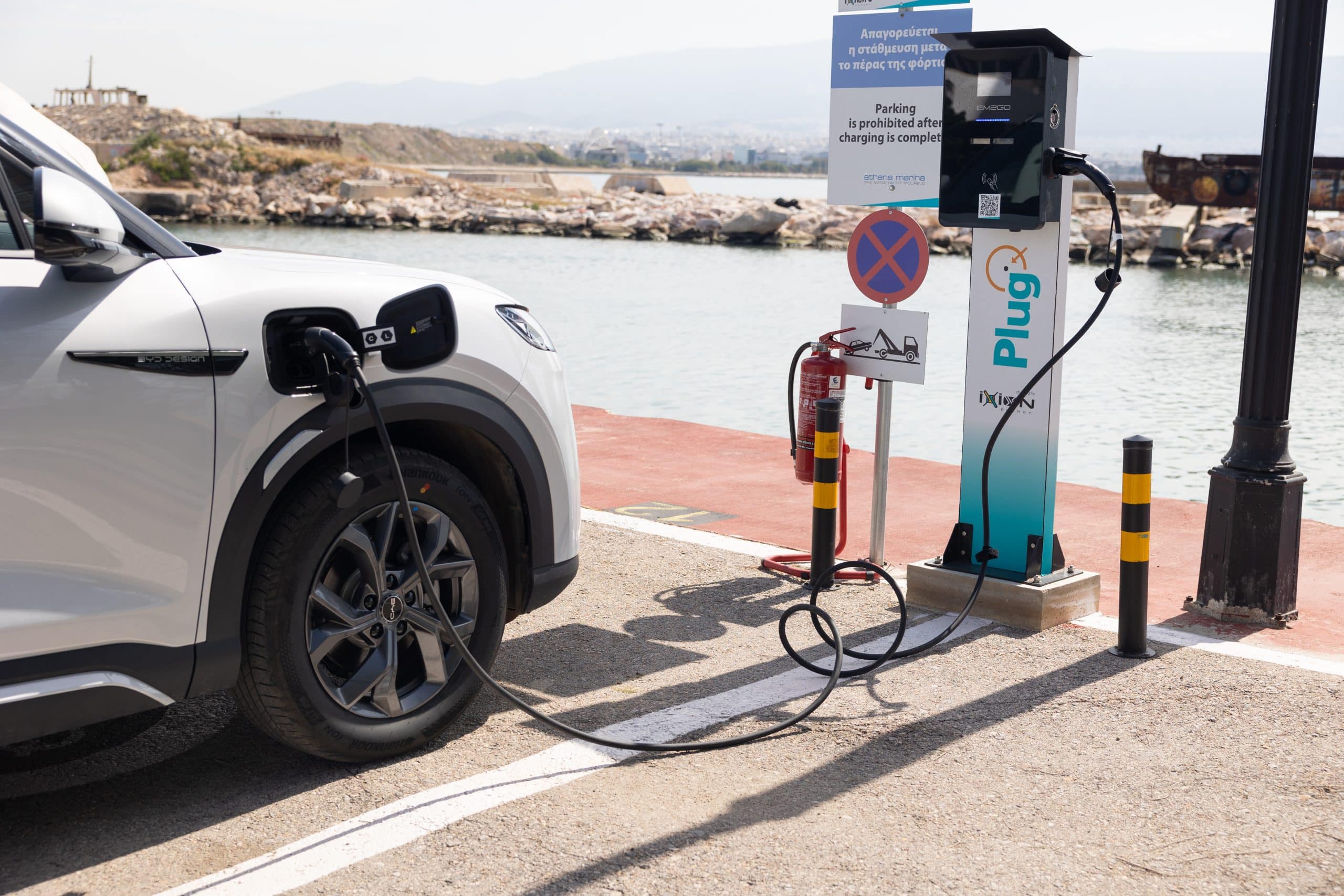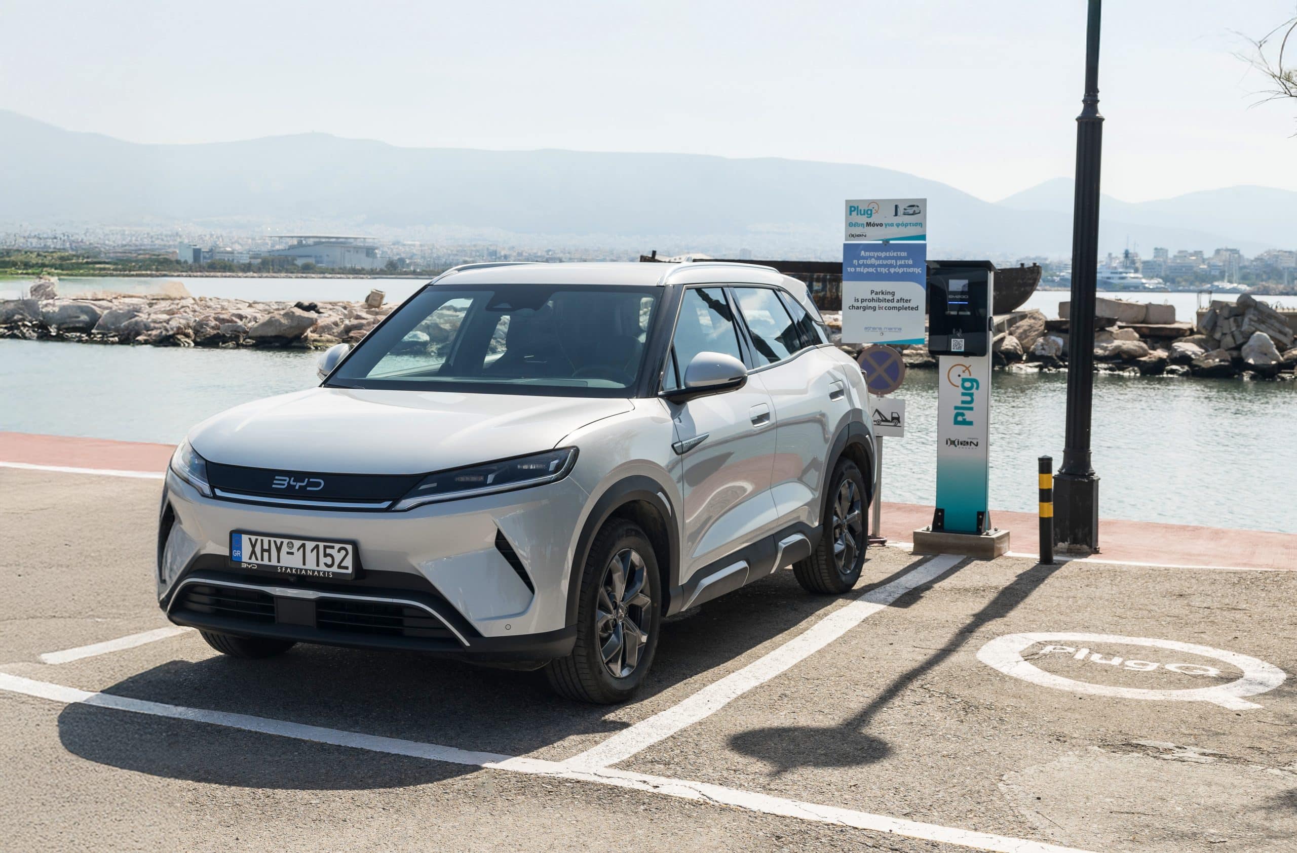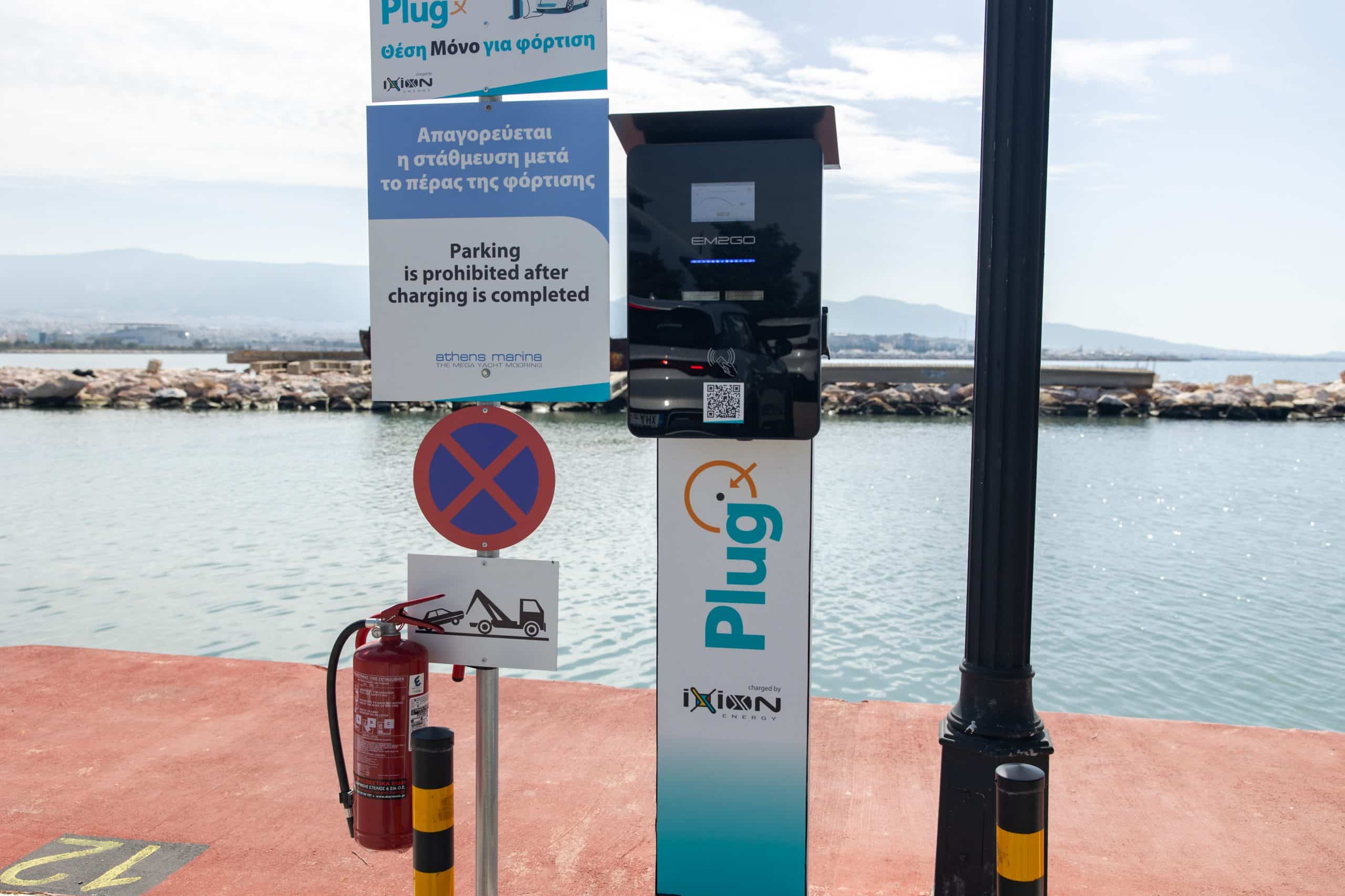 H φόρτιση του BYD Atto 2 πραγματοποιήθηκε στον φορτιστή της εταιρείας iXion μέσω της εφαρμογής PlugQ, που βρίσκεται στην μαρίνα Αθηνών.
