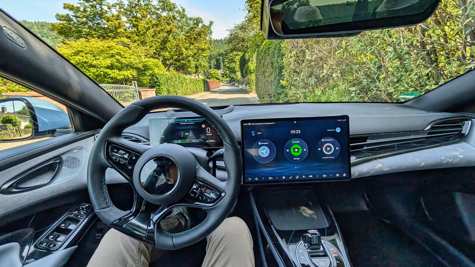 Τα σχόλια από τους θεατές στο δρόμο, ήταν στην πλειοψηφία τους θετικά: ο σχεδιασμός θεωρήθηκε υψηλής ποιότητας, με αναφορές σε premium οχήματα όπως η Mercedes EQS. Αυτή ήταν και η δική μας αίσθηση κατά την πρώτη επαφή με το αυτοκίνητο. Ειδικά από το εσωτερικό – κοιτώντας πάνω από το μακρύ καπό – η οπτική εντύπωση είναι, ότι κάθεσαι σε ένα μεγαλύτερο αυτοκίνητο.