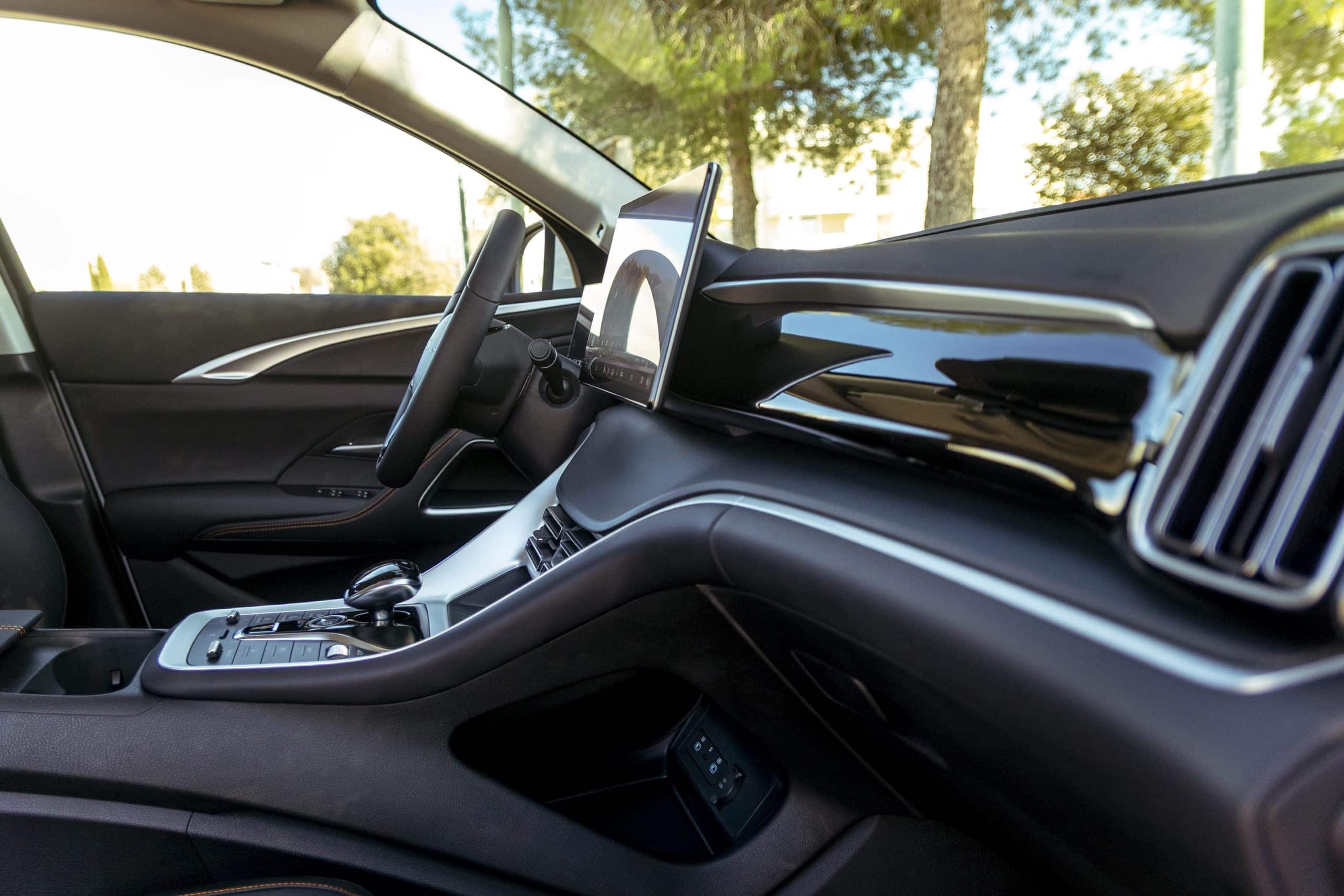 Το σημείο αναφοράς είναι αναμφισβήτητα η κεντρική οθόνη του συστήματος infotainment με διαγώνιο 15,6 ιντσών η οποία περιστρέφεται ηλεκτρικά από οριζόντια σε κάθετη θέση με το πάτημα ενός κουμπιού στο τιμόνι ή στην γωνία της οθόνης. Αυτό το στοιχείο δεν είναι μόνο ένας εντυπωσιασμός για τους επιβάτες αλλά προσφέρει πραγματική χρηστικότητα ανάλογα με την εφαρμογή που χρησιμοποιείται όπως για παράδειγμα στην πλοήγηση όπου η κάθετη διάταξη προσφέρει πολύ καλύτερη εποπτεία της διαδρομής που ακολουθεί.