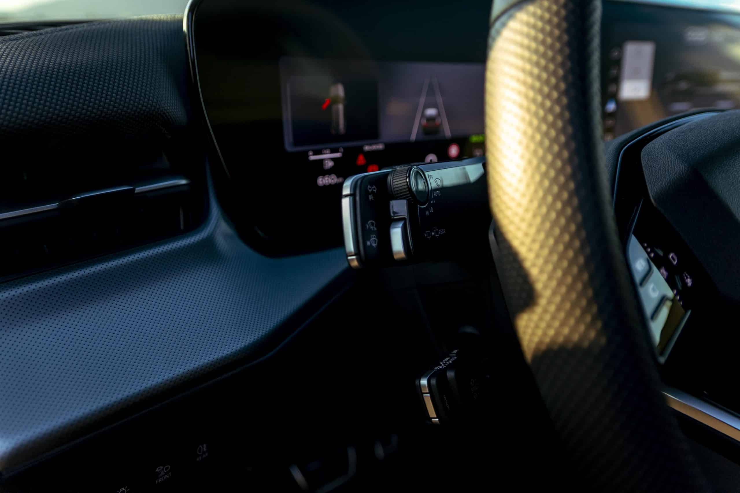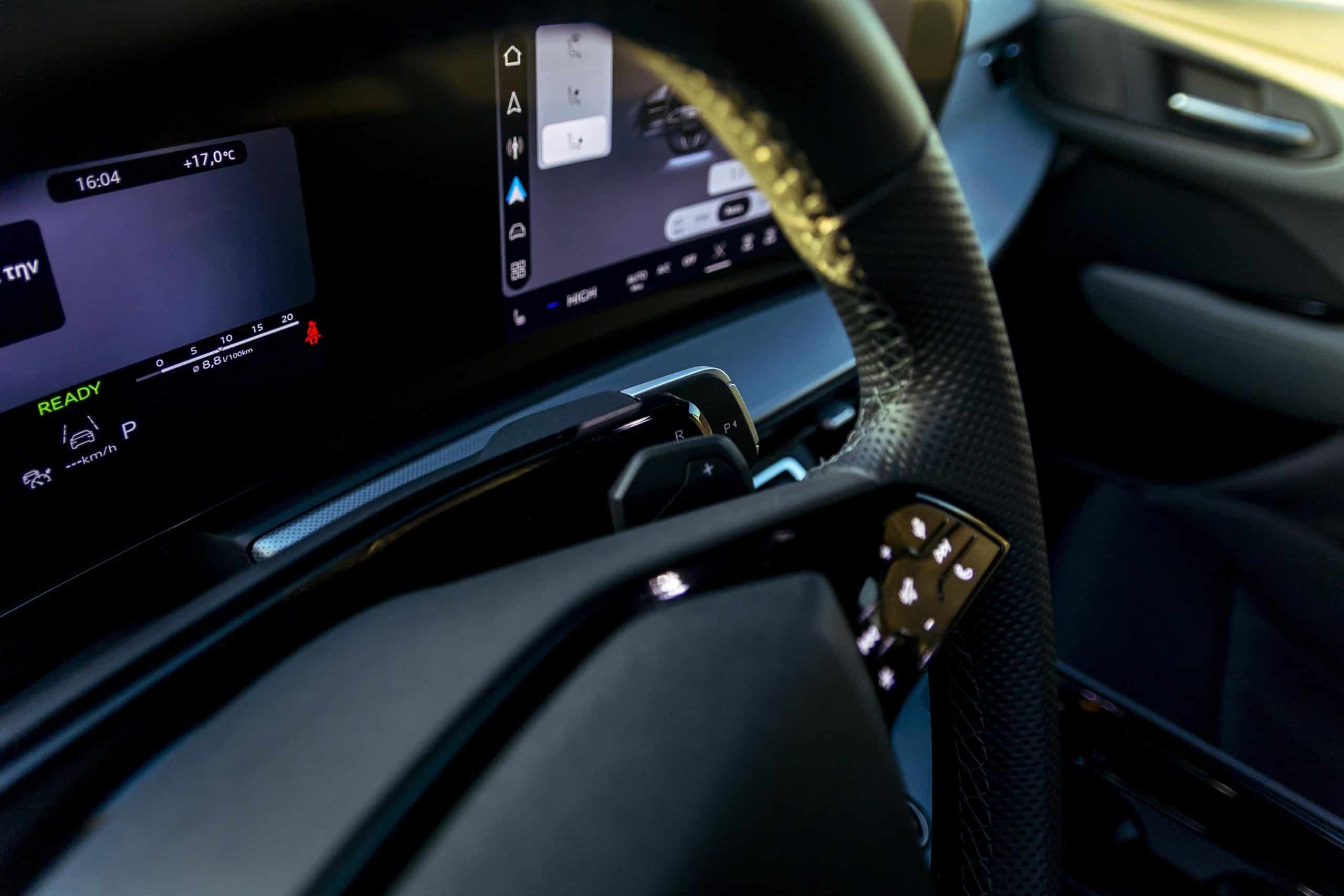 Στο εσωτερικό, η πρώτη αίσθηση που δίνει είναι η ποιότητα. Τα υλικά έχουν επιλεγεί με προσοχή, οι συναρμογές είναι πολύ καλές και η συνολική ατμόσφαιρα θυμίζει μεγαλύτερης κατηγορίας μοντέλο. Το ταμπλό αναπτύσσεται κυρίως γύρω από τον οδηγό, με ελαφρά κλίση της κεντρικής κονσόλας προς την αριστερή πλευρά, δημιουργώντας ένα περιβάλλον που ευνοεί την συγκέντρωση στον χειρισμό.