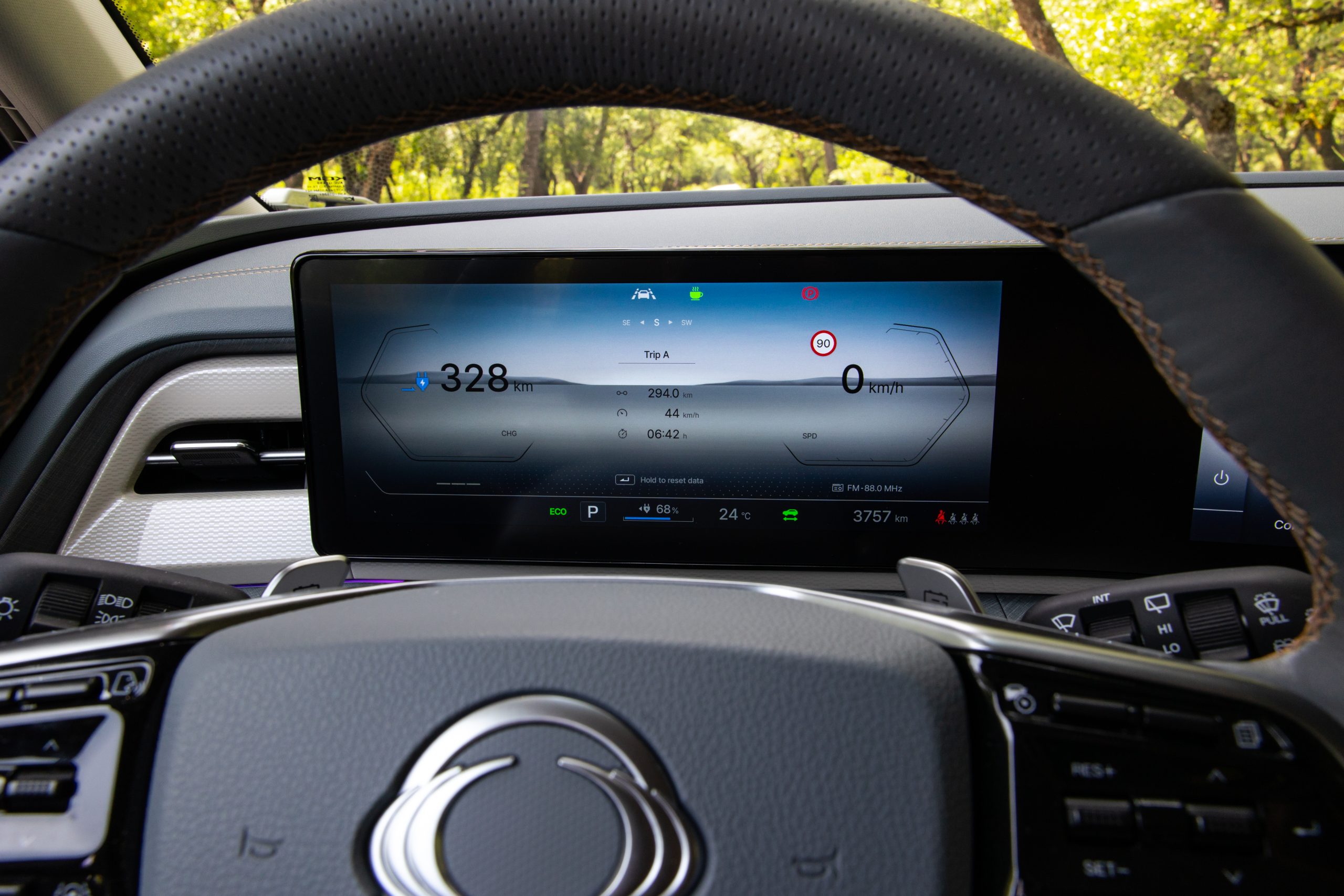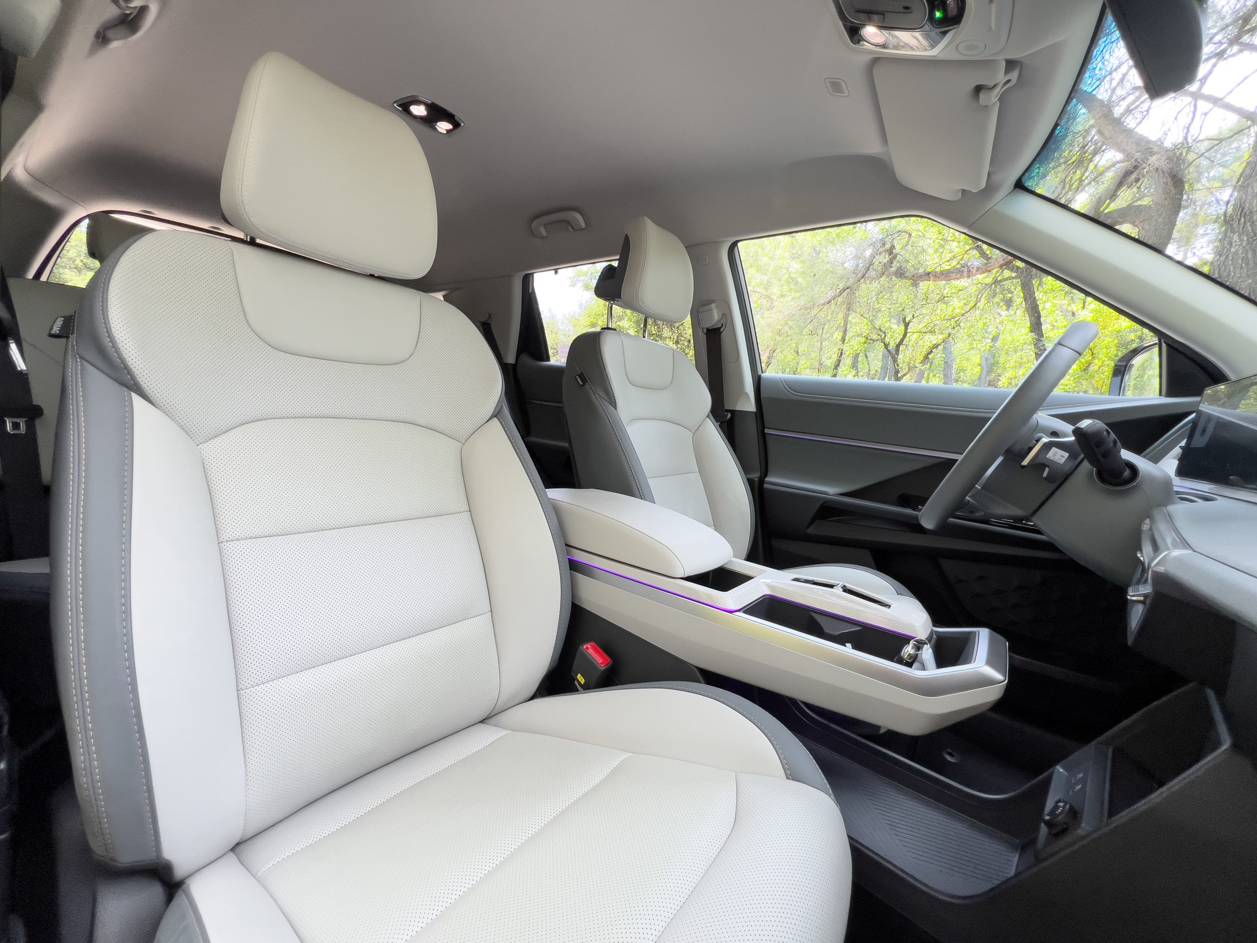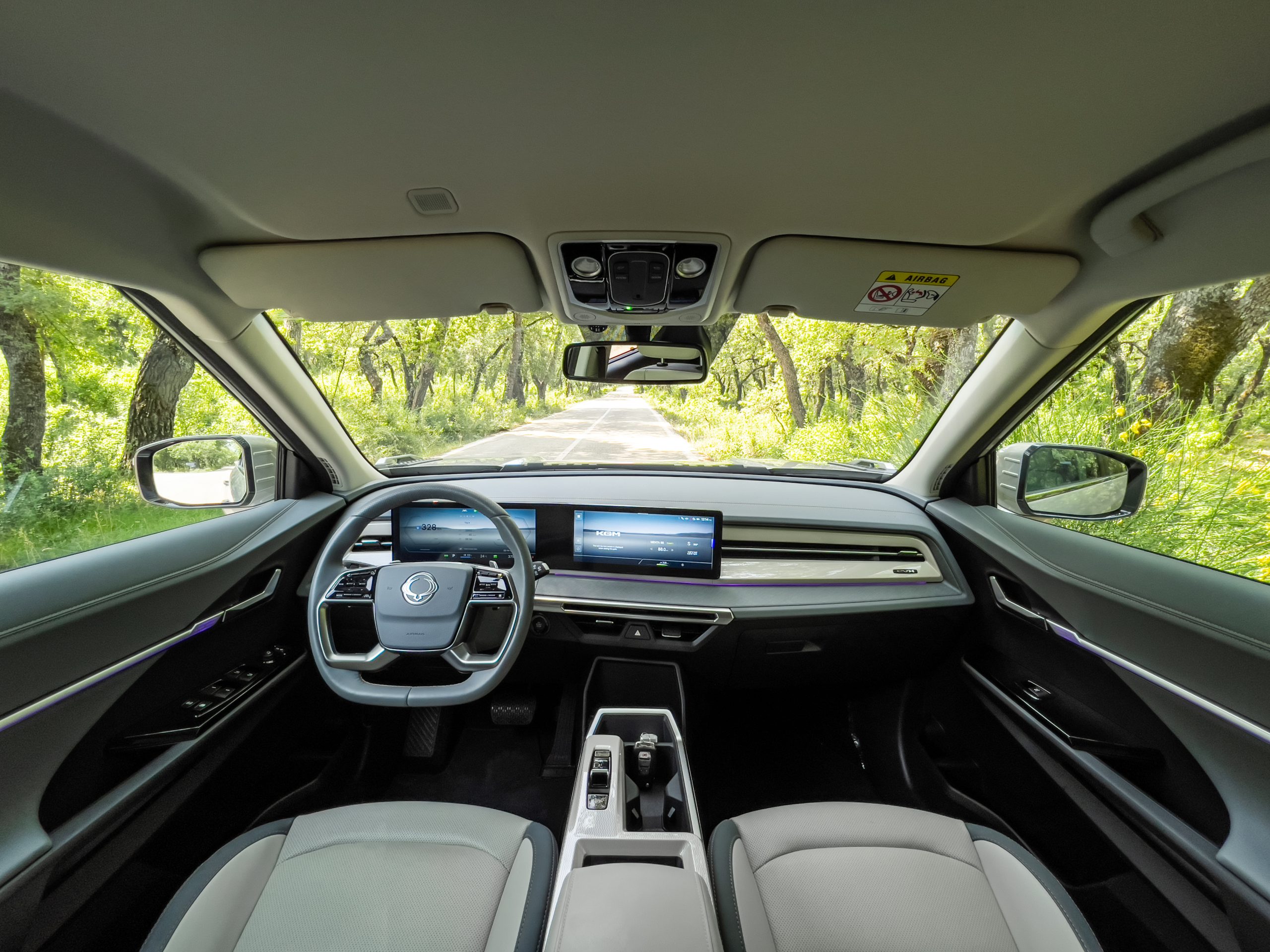 Στο εσωτερικό, ο μινιμαλισμός συνδυάζεται με εργονομία και πρακτικότητα. Το ταμπλό φιλοξενεί δύο οθόνες 12,3 ιντσών, σε ενιαία μορφή «πλωτής» επιφάνειας. Αυτές έχουν ευκρινή γραφικά και γρήγορη απόκριση και λειτουργικό σύστημα απλό, χωρίς περιττούς εντυπωσιασμούς. Ώστε να προσφέρει με σαφήνεια τις βασικές πληροφορίες στον οδηγό, ενώ το μενού του infotainment εστιάζει στη χρηστικότητα, «μιλά» Ελληνικά και έχει εύκολη συνδεσιμότητα με smartphone, αλλά όχι ασύρματη σύνδεση Android Auto.