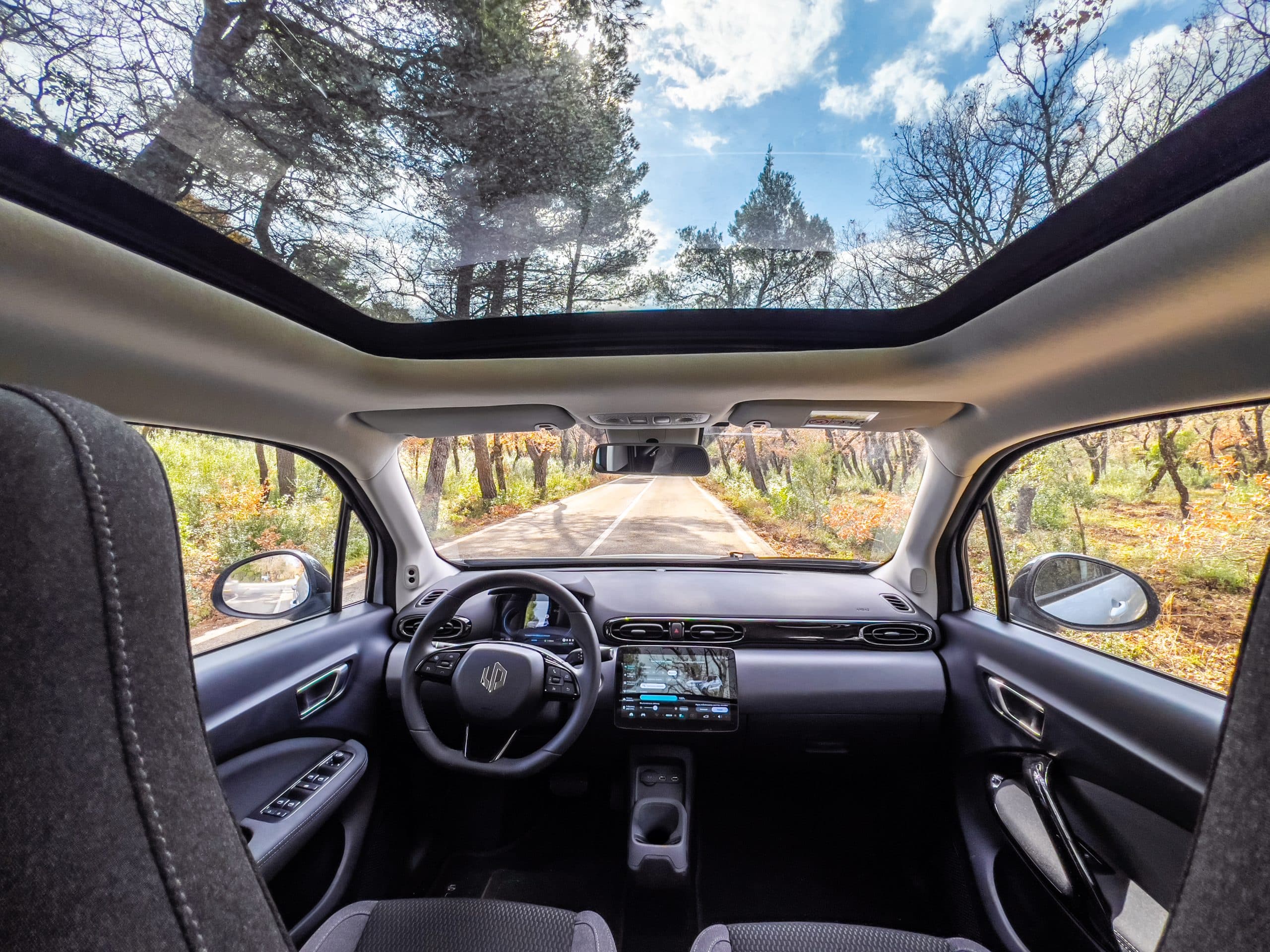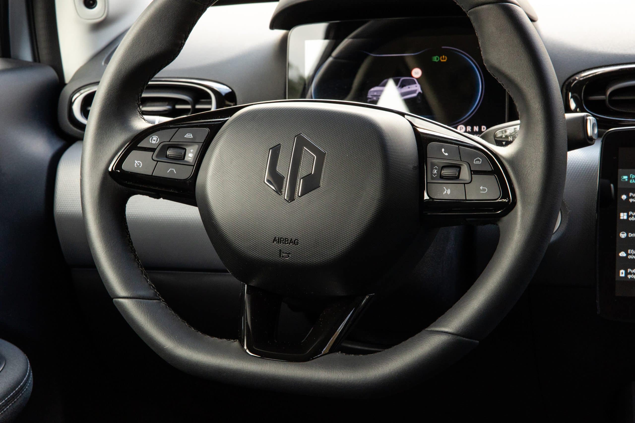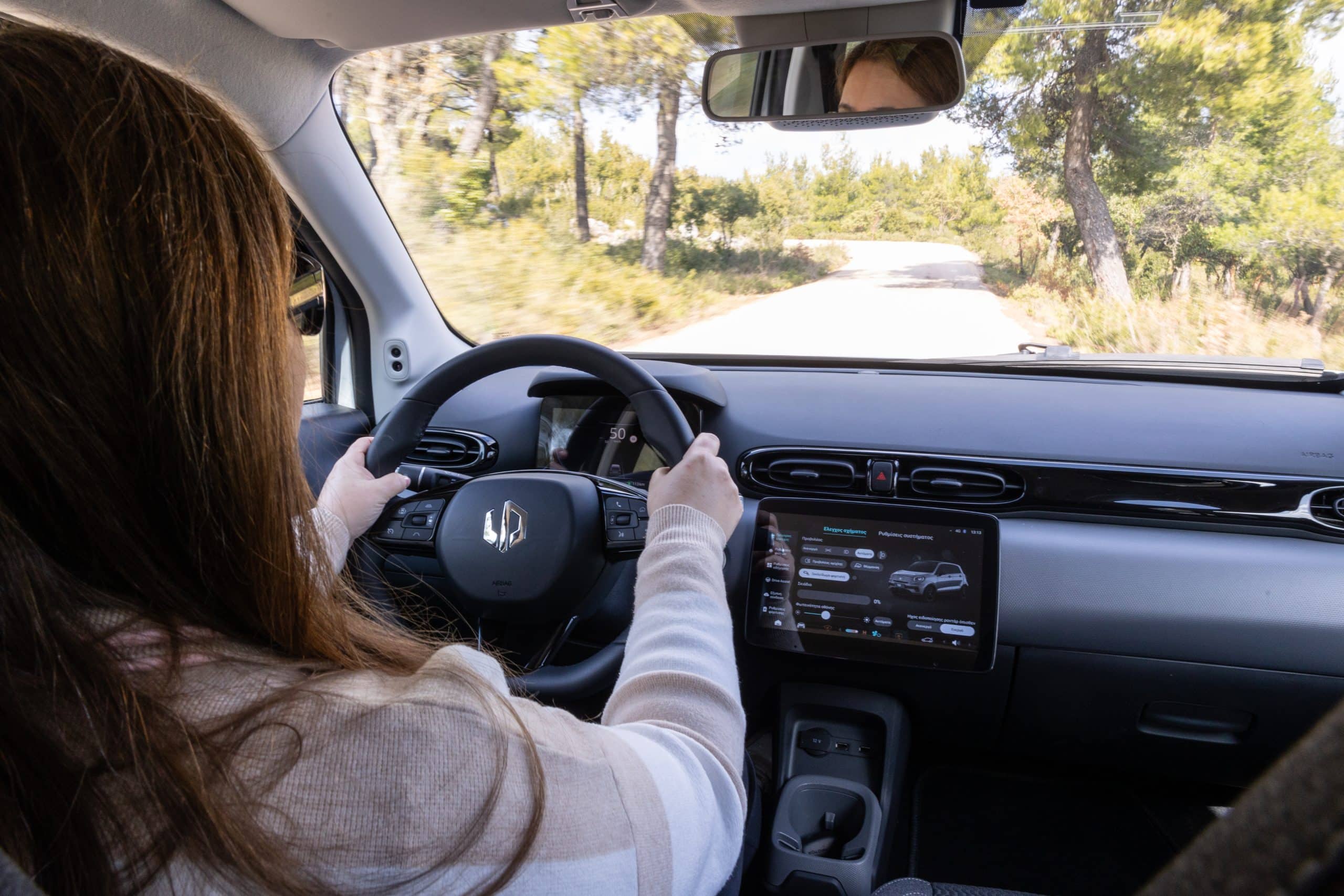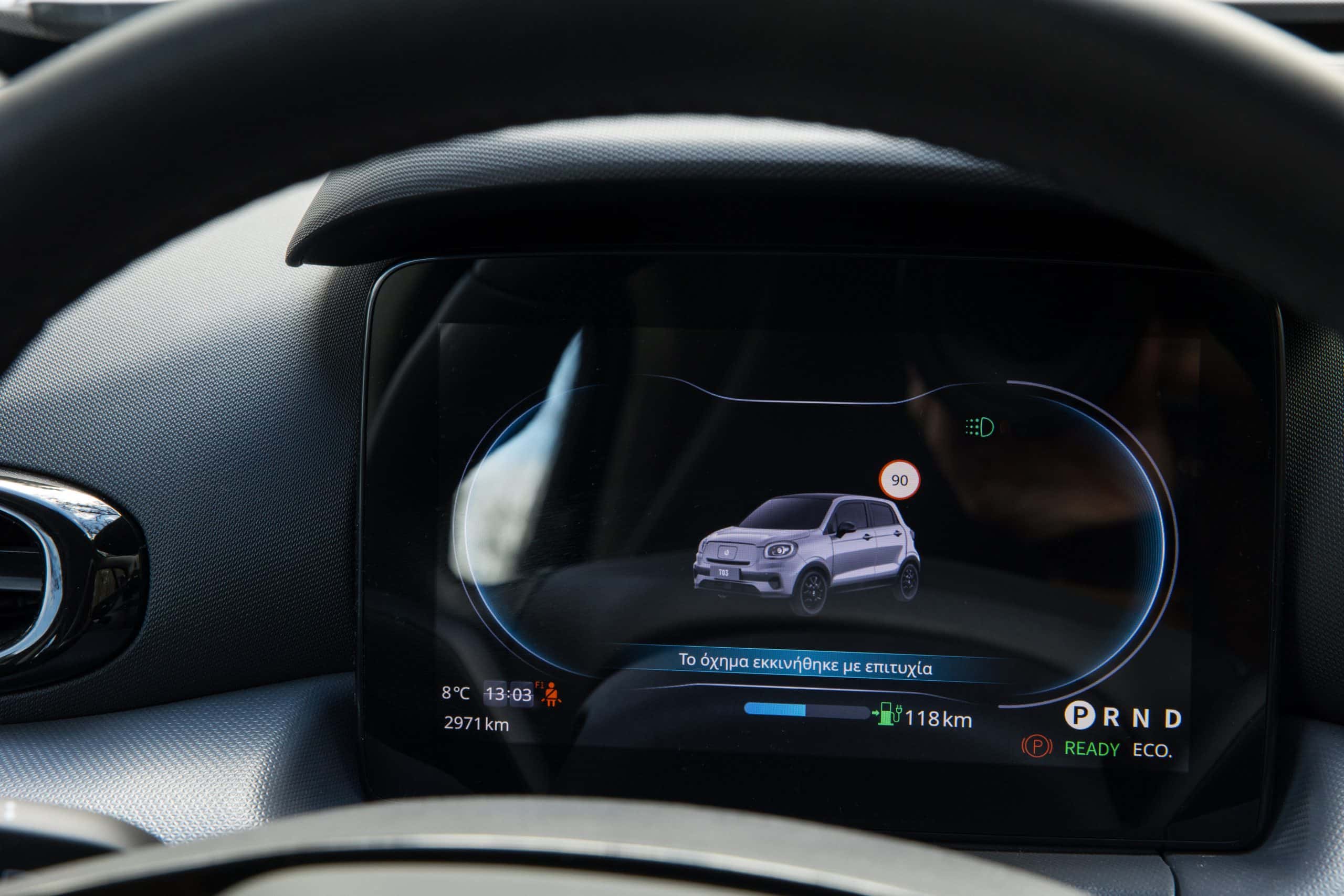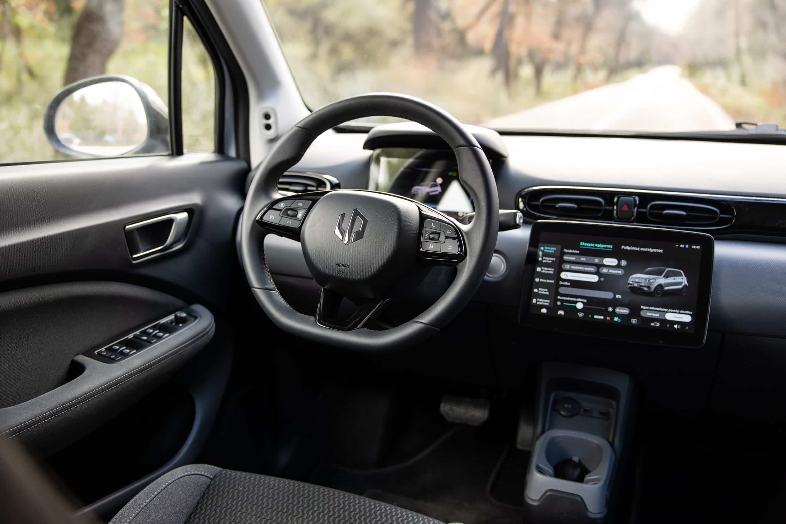 Η θέση οδήγησης είναι ψηλή, προσφέροντας καλή ορατότητα, ενώ τα καθίσματα είναι άνετα για καθημερινή χρήση. Ωστόσο, η έλλειψη ασύρματης σύνδεσης Apple CarPlay και Android Auto, κάτι που θα περίμενε κανείς από ένα σύγχρονο ηλεκτρικό μοντέλο, είναι αισθητή. Ο χώρος αποσκευών των 210 λίτρων είναι επαρκής για τις καθημερινές ανάγκες, ενώ με την αναδίπλωση των πίσω καθισμάτων φτάνει τα 880 λίτρα με τα πίσω καθίσματα αναδιπλωμένα, επιτρέποντας τη μεταφορά μεγαλύτερων αντικειμένων. Τέλος 16 χώροι αποθήκευσης μικρών αντικειμένων φροντίζουν για την τάξη μέσα στην καμπίνα.