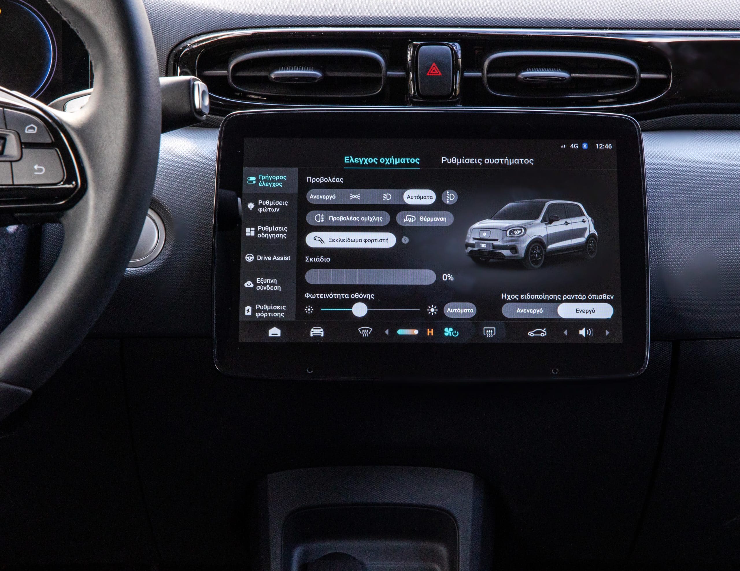 Μπαίνοντας στην καμπίνα του Leapmotor T03, η πρώτη εντύπωση είναι θετική. Παρά τις μικρές εξωτερικές διαστάσεις, το εσωτερικό είναι ευρύχωρο και καλά εξοπλισμένο. Ο ψηφιακός πίνακας οργάνων 8 ιντσών είναι ευανάγνωστος, ενώ η κεντρική οθόνη αφής 10,1 ιντσών βρίσκεται σε εργονομική θέση και διαθέτει σύγχρονα γραφικά.