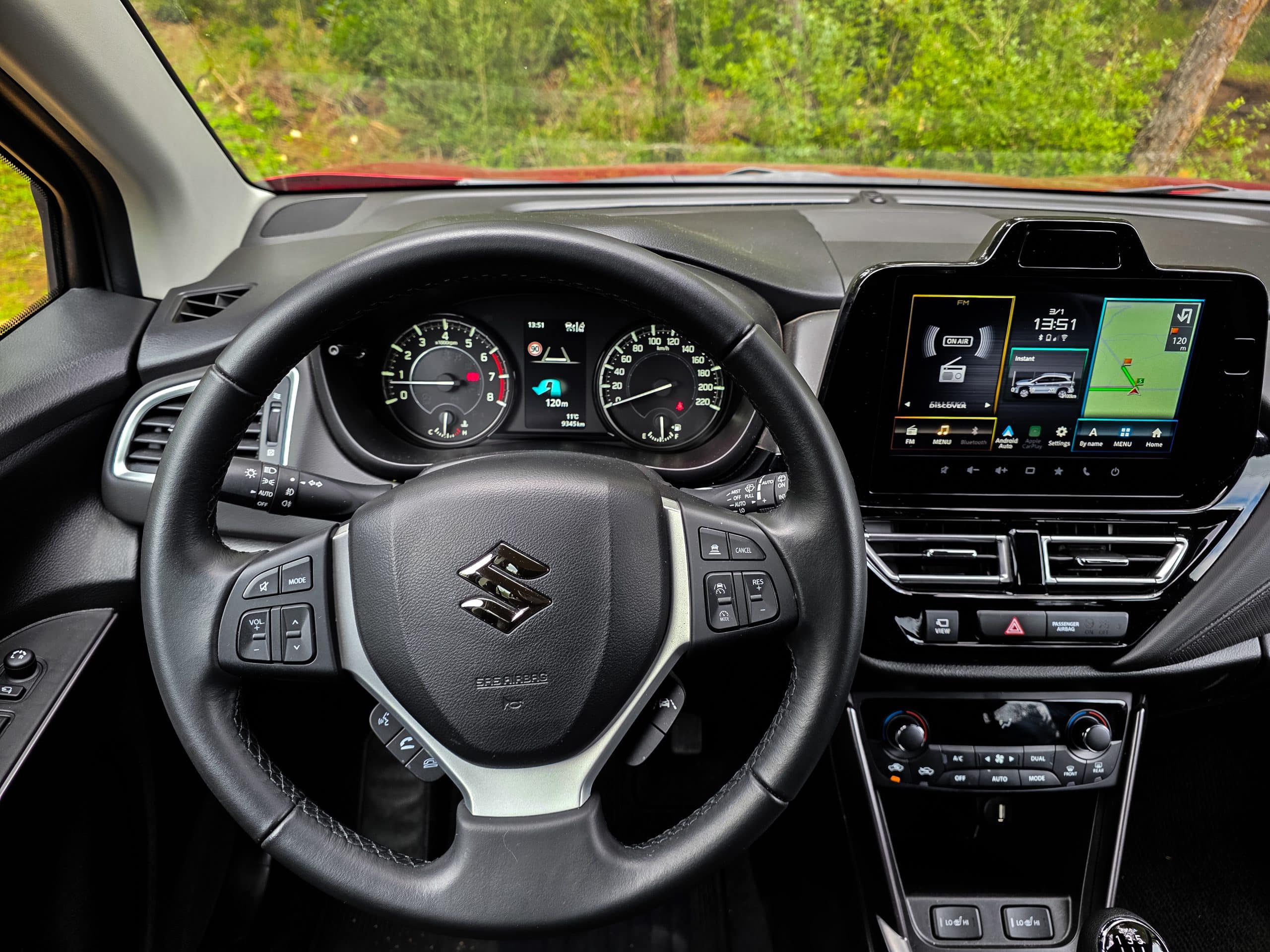 Το νέο S-Cross προσφέρει δύο επιλογές υβριδικών κινητήρων. Πέρα από τον ήπια υβριδικό 1.4 BoosterJet Hybrid 48V της δοκιμής μας υπάρχει ο 1.5 DualJet Strong Hybrid. Ο πρώτος (γνωστός και από το Vitara) είναι ένας υπερτροφοδοτούμενος βενζινοκινητήρας που αποδίδει 129 ίππους στις 5.500 σ.α.λ. και 235 Nm ροπής από τις 2.000 έως τις 3.000 σ.α.λ. Το ήπια υβριδικό σύστημα 48V περιλαμβάνει μια ηλεκτρογεννήτρια 17 ίππων που υποβοηθά τον κινητήρα κατά την επιτάχυνση και λειτουργεί ως μίζα για το σύστημα stop/start. Η μπαταρία του συστήματος έχει χωρητικότητα 0,38 kWh και φορτίζεται μέσω ανάκτησης ενέργειας κατά την επιβράδυνση. Έτσι το S-Cross επιταχύνει από στάση στα 100 χλμ./ώρα σε 9,5 δευτερόλεπτα και έχει ως μέγιστη ταχύτητα τα 195 χλμ./ώρα. Αλλά το σημαντικότερο, καταφέρνει να κρατήσει την κατανάλωση σε πολύ χαμηλά επίπεδα, ακόμα και κάτω από τα 6,5 λίτρα καυσίμου ανά 100 χιλιόμετρα σε πραγματικές συνθήκες κίνησης.