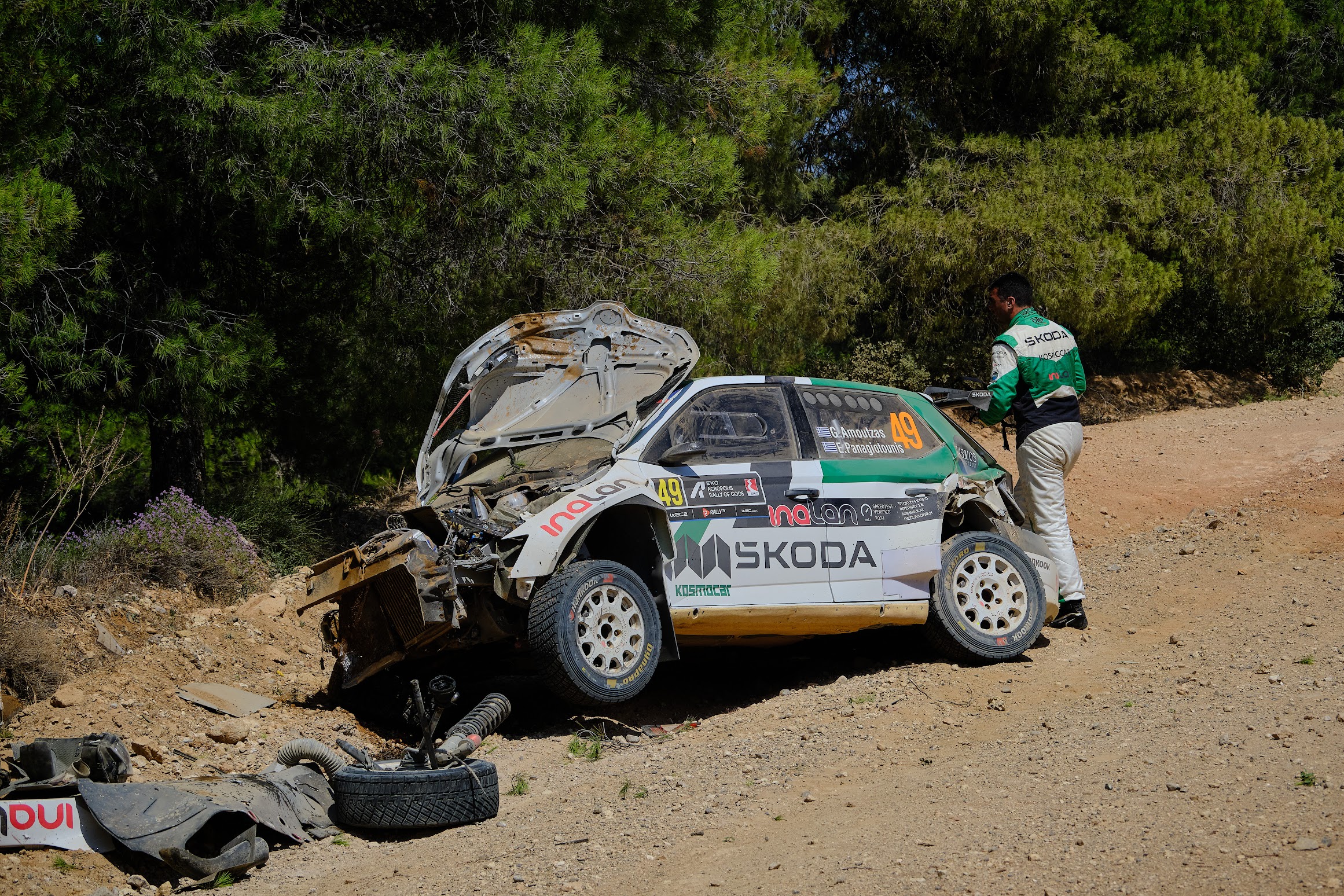 Εκτός αγώνα τέθηκαν οι Αμούτζας–Παναγιωτούνης, μετά από έξοδο που προκάλεσε σημαντική ζημιά στο Skoda Fabia Rally2, στερώντας τους τη δυνατότητα να επανεκκινήσουν.