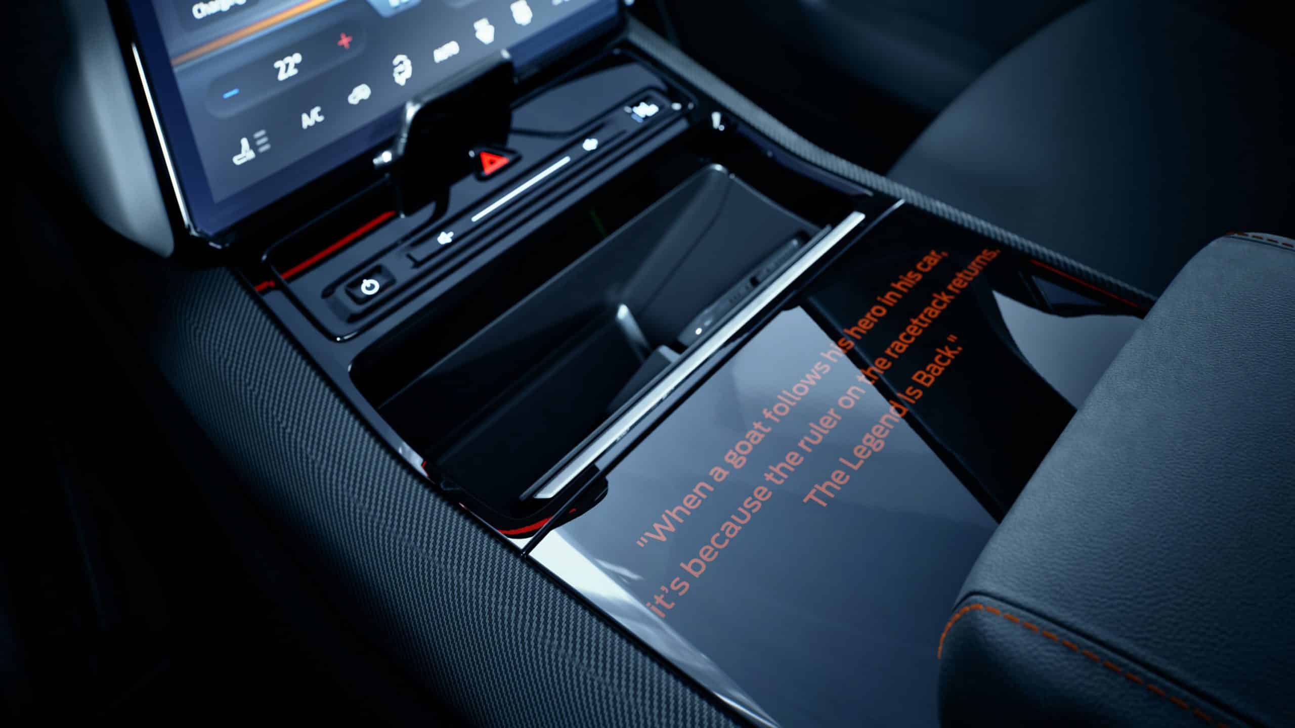 Με τις χαρακτηριστικές πινελιές στις εξωτερικές επιφάνειες του μοναδικού αυτού Ford Capri να τιμούν την καριέρα του Eric Cantona ως ποδοσφαιριστή, το εσωτερικό έρχεται με τη σειρά του να «φωτογραφίσει» τον ατίθασο χαρακτήρα του. Έτσι, στην κεντρική κονσόλα, γνωστή ως MegaConsole, δημιουργήθηκε ένα αφαιρούμενο κάλυμμα πάνω από τις ποτηροθήκες. Προϊόν τρισδιάστατης εκτύπωσης και με φινίρισμα από γυαλιστερό πλεξιγκλάς, περιέχει τη φράση του Eric Cantona που είπε κατά την προετοιμασία της παρουσίασης του Capri: «Όταν μια κατσίκα ακολουθεί τον ήρωά της στο αυτοκίνητό του, είναι επειδή ο κυρίαρχος της πίστας επιστρέφει. Ο Θρύλος Επέστρεψε». Το κείμενο είναι γραμμένο σε χρώμα Signal Orange και αναδεικνύεται με τον φωτισμό της καμπίνας.