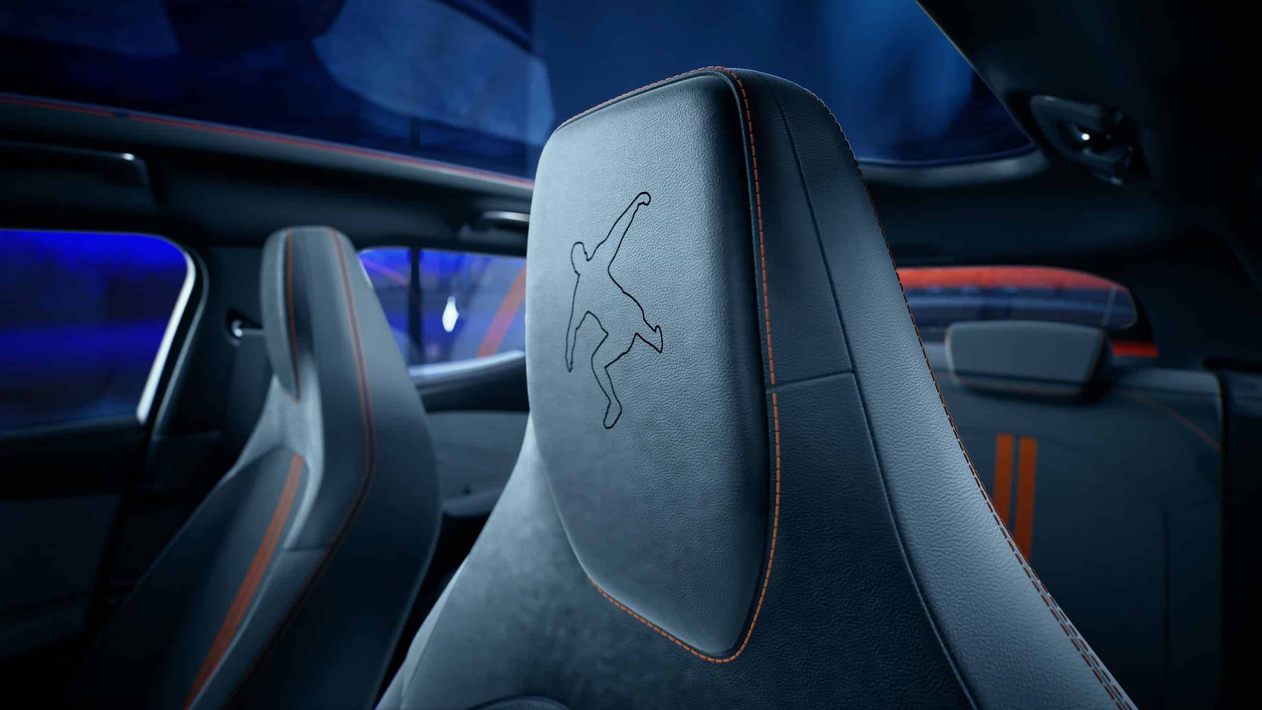 Στα εμπρός προσκέφαλα γίνεται επίσης μια χιουμοριστική αναφορά σε μία από τις πιο γνωστές στιγμές του Eric Cantona εντός γηπέδων – και συγκεκριμένα στην περίφημη κλοτσιά κουνγκ φου – η οποία είναι ραμμένη στο ύφασμα. Τα καθίσματα διαθέτουν επένδυση Feeltek Luxury Grain με πορτοκαλί ραφές και διπλές λωρίδες σε Signal Orange, κατ’ αντιστοιχία εκείνων των εξωτερικών επιφανειών. Τα ειδικά σχεδιασμένα πατάκια έχουν περίγραμμα από nubuck με πορτοκαλί ραφές, ενώ το τιμόνι φέρει μία νέα δερμάτινη επένδυση. Επίσης, η κατακόρυφη ακτίνα του είναι βαμμένη στο χρώμα Signal Orange.