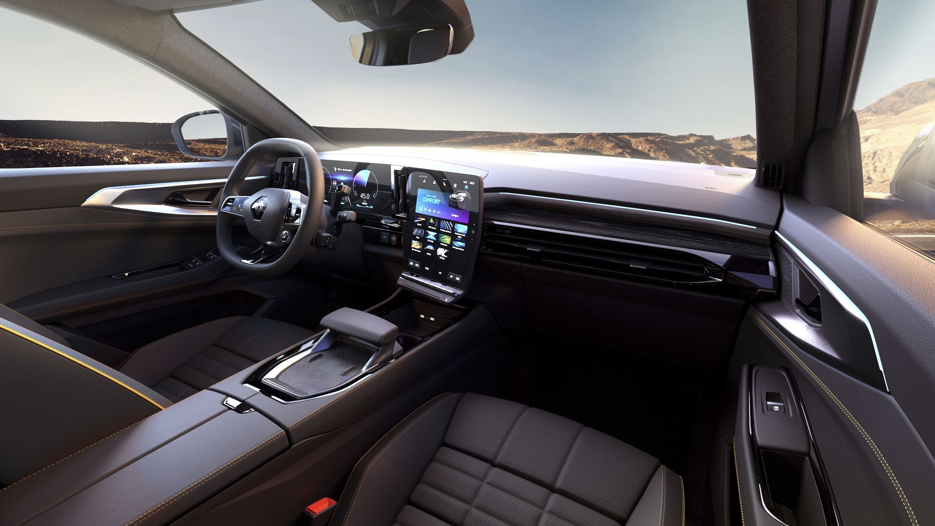 Στο εσωτερικό του Renault Austral ξεχωρίζουμε το high-tech cockpit με την εντυπωσιακή οθόνη του συστήματος OpenR. Ακόμη, μεγάλη εντύπωση προκαλεί το συρόμενο υποβραχιόνιο, το οποίο οδηγεί το χέρι στη σωστή θέση για τη χρήση της οθόνης πολυμέσων. Επιπλέον, προσφέρει την κατάλληλη στήριξη για τη χρήση των διάφορων μπουτόν.