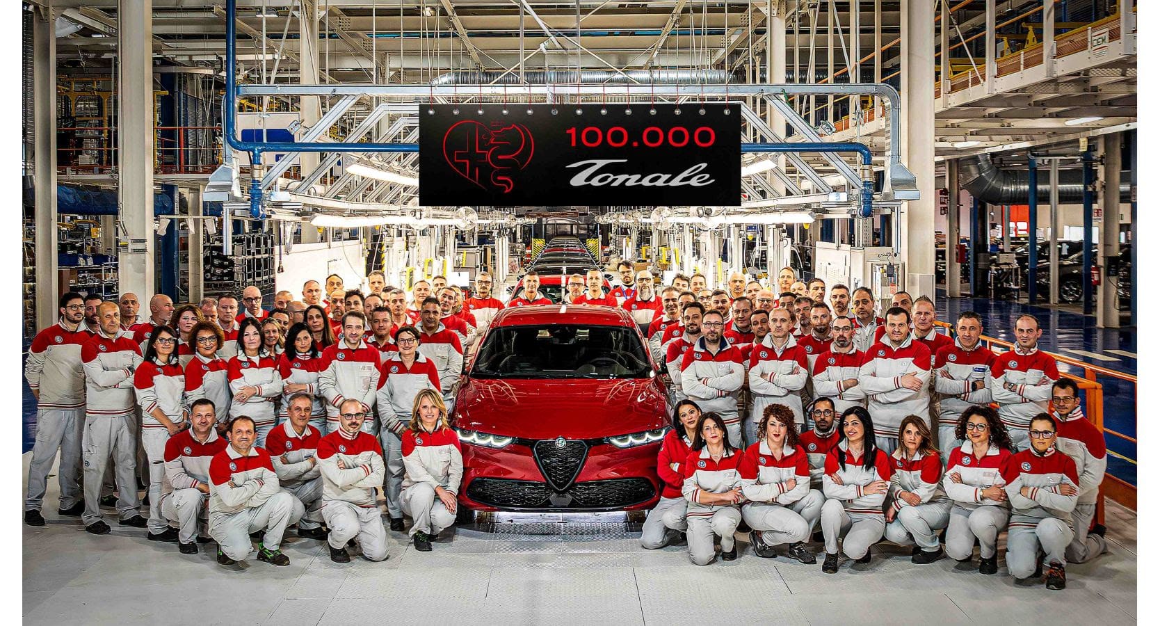 Μια κατακόκκινη Tonale που προορίζεται για την αγορά της Ιταλίας ήταν η υπ’ αριθμόν 100.000 που βγήκε από το εργοστάσιο “Giambattista Vico”, επιβεβαιώνοντας την πετυχημένη πορεία της πρώτης εξηλεκτρισμένης Alfa Romeo, η οποία ταυτόχρονα είναι και το πρώτο C-SUV μοντέλο της μάρκας.