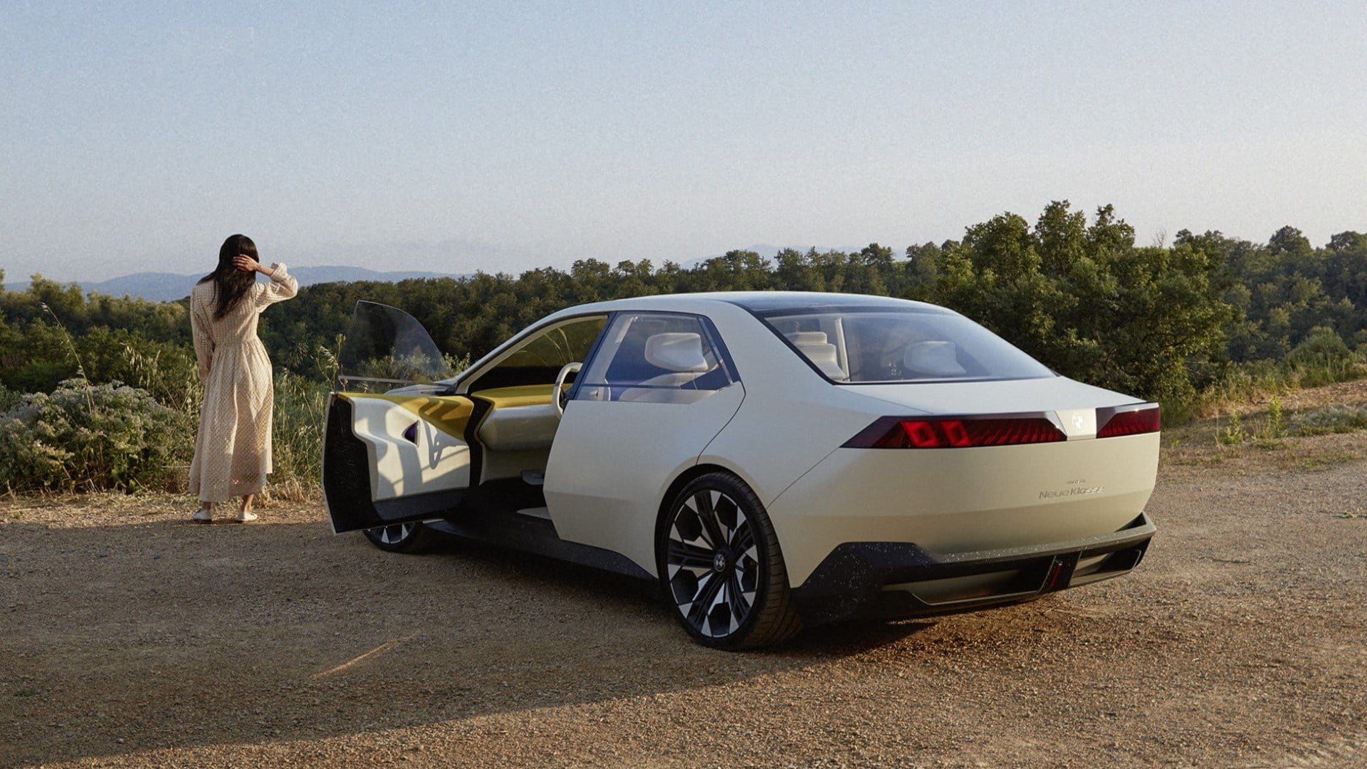 Η σχεδίαση της Vision Neue Klasse είναι καθαρή, κομψή και διαχρονική. Οι στιβαροί θόλοι των τροχών, οι μετατοπισμένες προς τα πίσω γυάλινες επιφάνειες και η έντονη κλίση προς τα εμπρός του μπροστινού τμήματος που θυμίζει ρύγχος καρχαρία, αποτελούν στοιχεία που χαρακτηρίζουν την BMW. Επιπλέον, οι αεροδυναμικές ζάντες των 21 ιντσών αντλούν έμπνευση από τον μηχανοκίνητο αθλητισμό. Ταυτόχρονα, οι έντονες εσοχές μπροστά και πίσω, καθώς και οι μεγάλες επιφάνειες παραθύρων, διαμορφώνουν μια νέα αισθητική.