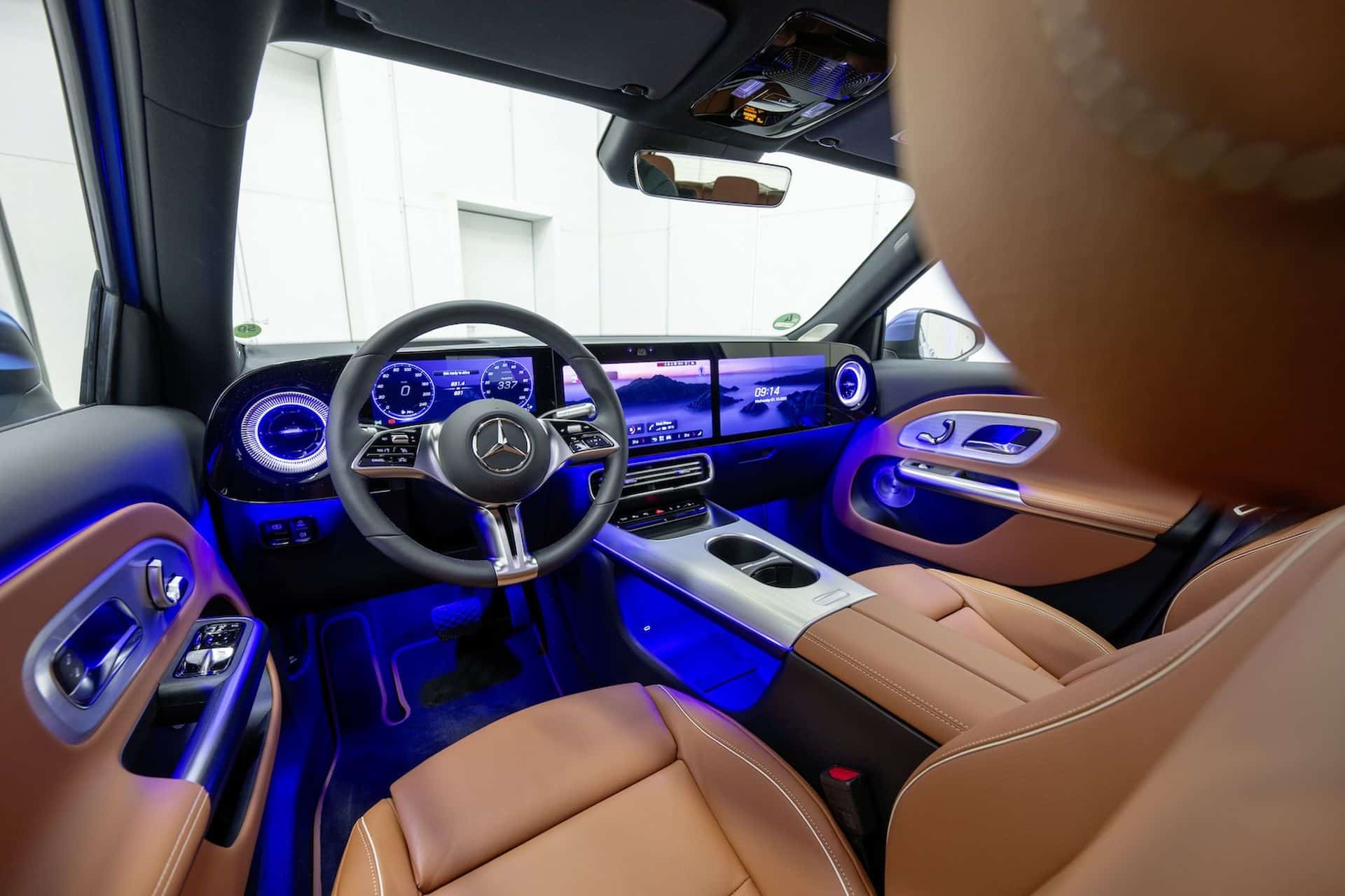 Η διάταξη αυτή θα είναι στάνταρ στις κορυφαίες εκδόσεις της GLB, ενώ θα προσφέρεται προαιρετικά στις υπόλοιπες. Όσες δεν την διαθέτουν, θα έχουν παρόμοιο σχεδιασμό ταμπλό, αλλά με διακοσμητικό πάνελ, στη θέση της οθόνης του συνοδηγού. Το σύστημα MBUX τέταρτης γενιάς διαθέτει λειτουργία “zero-layer”, ώστε οι πιο συχνές ρυθμίσεις, να είναι πάντα διαθέσιμες στην αρχική οθόνη, ενώ ενσωματώνει Google Maps και τεχνητή νοημοσύνη, που μαθαίνει τις συνήθειες του οδηγού. Η αισθητική ολοκληρώνεται με αεραγωγούς τύπου τουρμπίνας και μία “αιωρούμενη” κεντρική κονσόλα, όπου βρίσκονται μερικά φυσικά κουμπιά, ποτηροθήκες και χώρος αποθήκευσης. Υπάρχει επίσης θέση για smartphone, με προαιρετική ασύρματη φόρτιση.