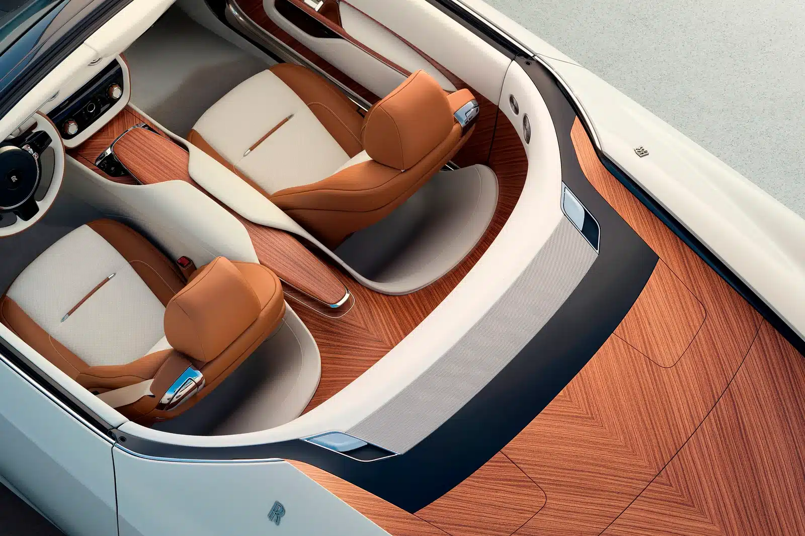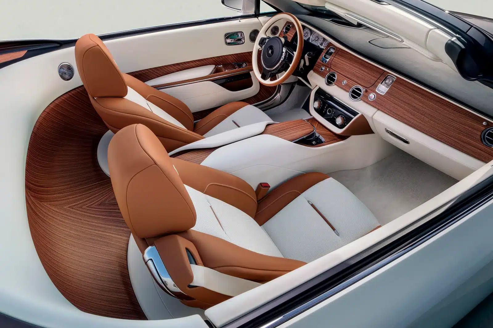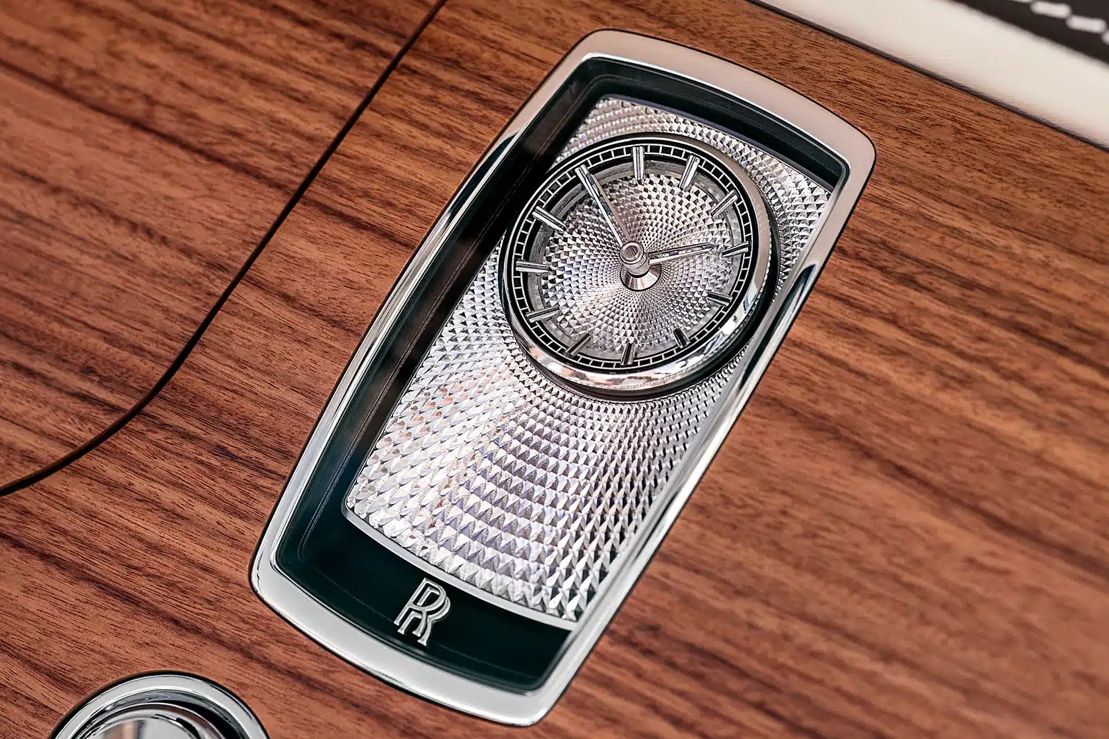 Όπως και με τις άλλες κατασκευές Droptail, το πιο εντυπωσιακό στοιχείο είναι οι ξύλινες επιφάνειες, που έχουν πάνω τους 8.000 εργατοώρες. Λεπτομέρεια, το ειδικής κατασκευής ρολόι, που έχουν και τα άλλα δύο Droptail. Αυτό έχει ενσωματωθεί στο ταμπλό από ξύλο Santos Straight Grain στο ταμπλό. Και η Rolls-Royce το περιγράφει ως το πιο πολύπλοκο που έχει δημιουργήσει ποτέ. Με τη συναρμολόγηση του να παίρνει πέντε μήνες για να ολοκληρωθεί. Χρόνος που προστέθηκε στα δύο χρόνια που πήρε η ανάπτυξη του ρολογιού. Όλο αυτό μπορεί να ακούγεται υπερβολικό, αλλά με μια πιο προσεκτική ματιά θα δούμε το γεωμετρικό σχέδιο guilloche που έχει 119 τμήματα.