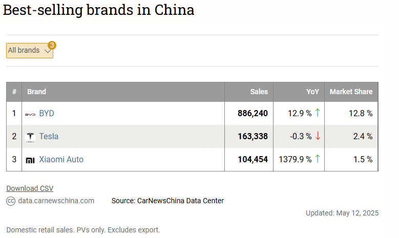 Κατά το πρώτο τετράμηνο του 2025 (Ιανουάριος – Απρίλιος), η Tesla πούλησε 163.338 οχήματα στην Κίνα, σημειώνοντας μικρή μείωση 0,3% σε σχέση με το προηγούμενο έτος. Την ίδια στιγμή, η BYD πούλησε 886.240 μονάδες (+12,9%), ενώ η Xiaomi σημείωσε εντυπωσιακή άνοδο με 104.454 πωλήσεις – αύξηση 1379,9% – αν και ξεκίνησε τις παραδόσεις μόλις τον Απρίλιο του 2024.