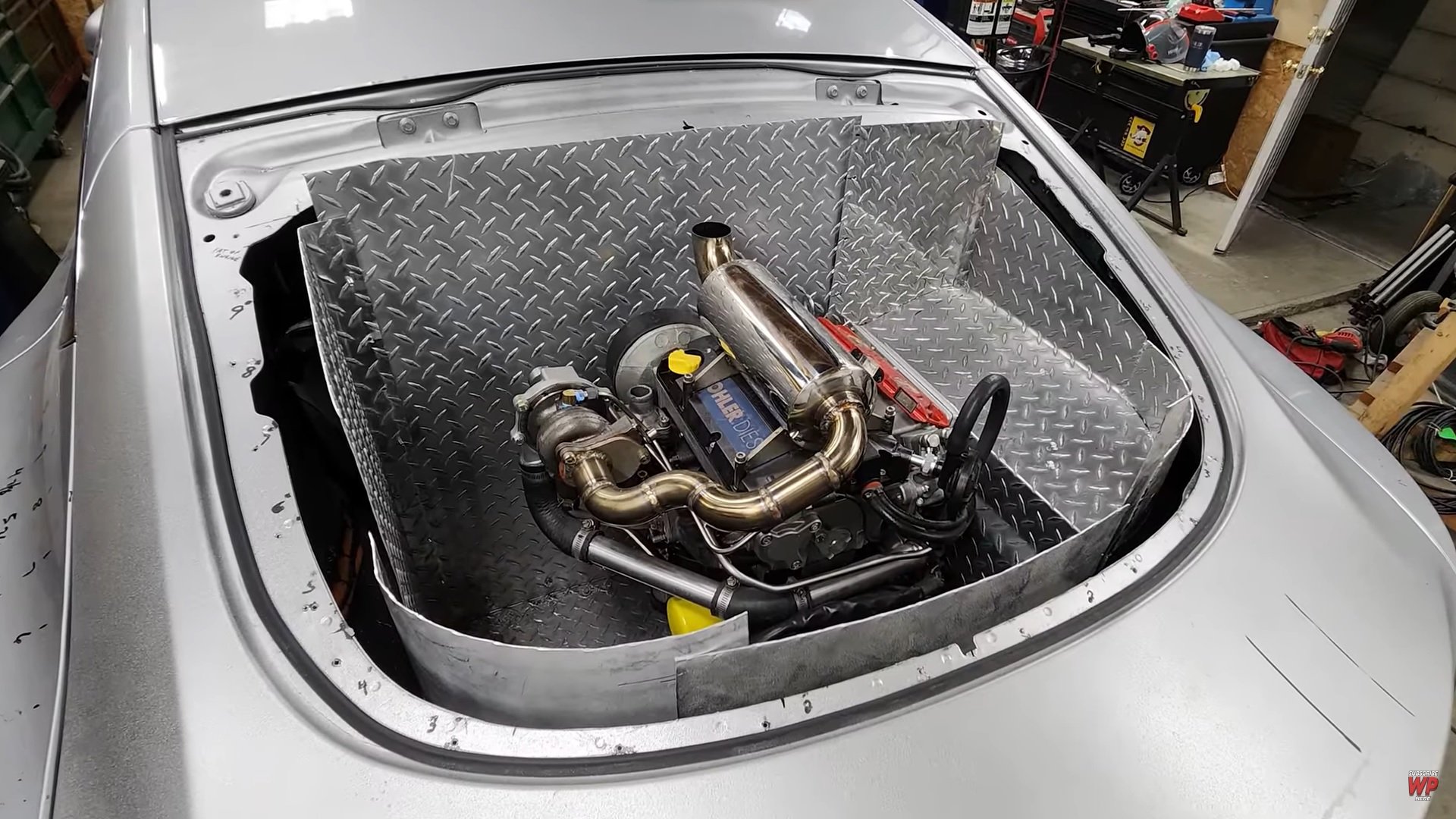 Έπειτα, τοποθέτησε περιμετρικά μεταλλικά τμήματα, ώστε να δημιουργήσει θερμομόνωση και όσο ήταν εφικτό, ηχομόνωση. Επιπλέον, εκτός από τον χώρο αποσκευών και το πίσω παρμπρίζ, το Tesla πλέον έχασε και τον εμπρόσθιο χώρο αποθήκευσης. Εκεί, ο YouTuber τοποθέτησε το ρεζερβουάρ καυσίμου, το οποίο τροφοδοτεί τον πετρελαιοκινητήρα των 26 ίππων στο πίσω μέρος του οχήματος.
