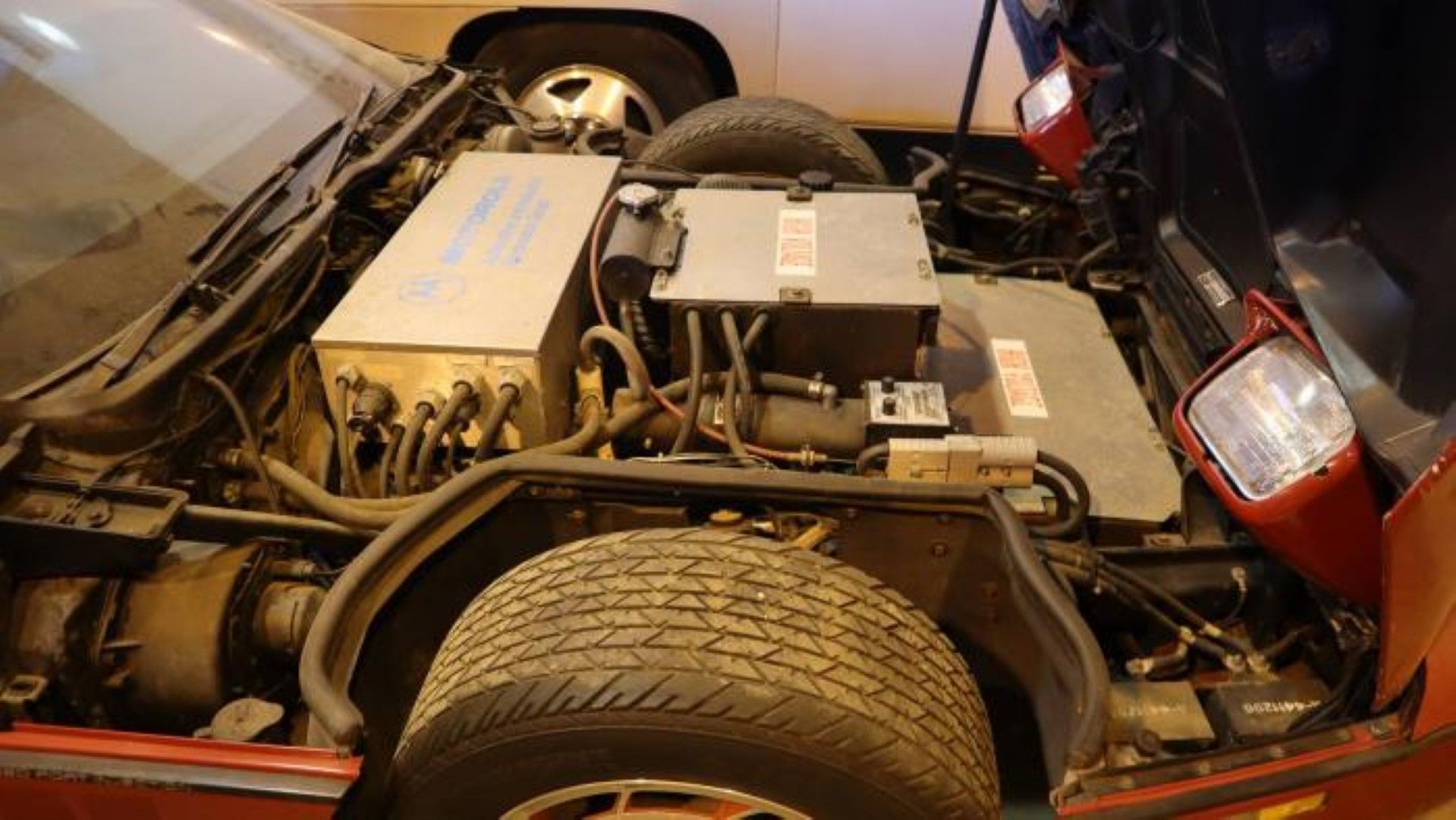 Εσωτερικά, όμως, το πράγμα αρχίζει να αποκτά ενδιαφέρον. Κάτω από το καπό, υπήρχε προφανώς ένας ηλεκτροκινητήρας και μεγάλα κουτιά μπαταριών. Επιπλέον, υπήρχαν καλώδια, αυτοκόλλητα «high voltage», καθώς και το σήμα της Motorola. Μπαταρίες υπήρχαν και στο πορτμπαγκάζ και κάτω από τα καθίσματα. Όλες οι μπαταρίες έχουν λήξει από το 1997.