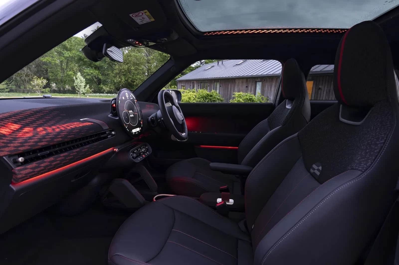 Το στυλ είναι 100% JCW: επιθετικό, με σπορ πινελιές. Ωστόσο, το εσωτερικό απογοητεύει: χωρίς δερμάτινες επιλογές, με υφάσματα και σκληρά πλαστικά που δεν συνάδουν με την premium τιμή του. Το ταμπλό διαθέτει μια εντυπωσιακή σφαιρική κεντρική οθόνη, αλλά απουσιάζει εντελώς ένας ψηφιακός πίνακας οργάνων πίσω από το τιμόνι και μια head-up display.