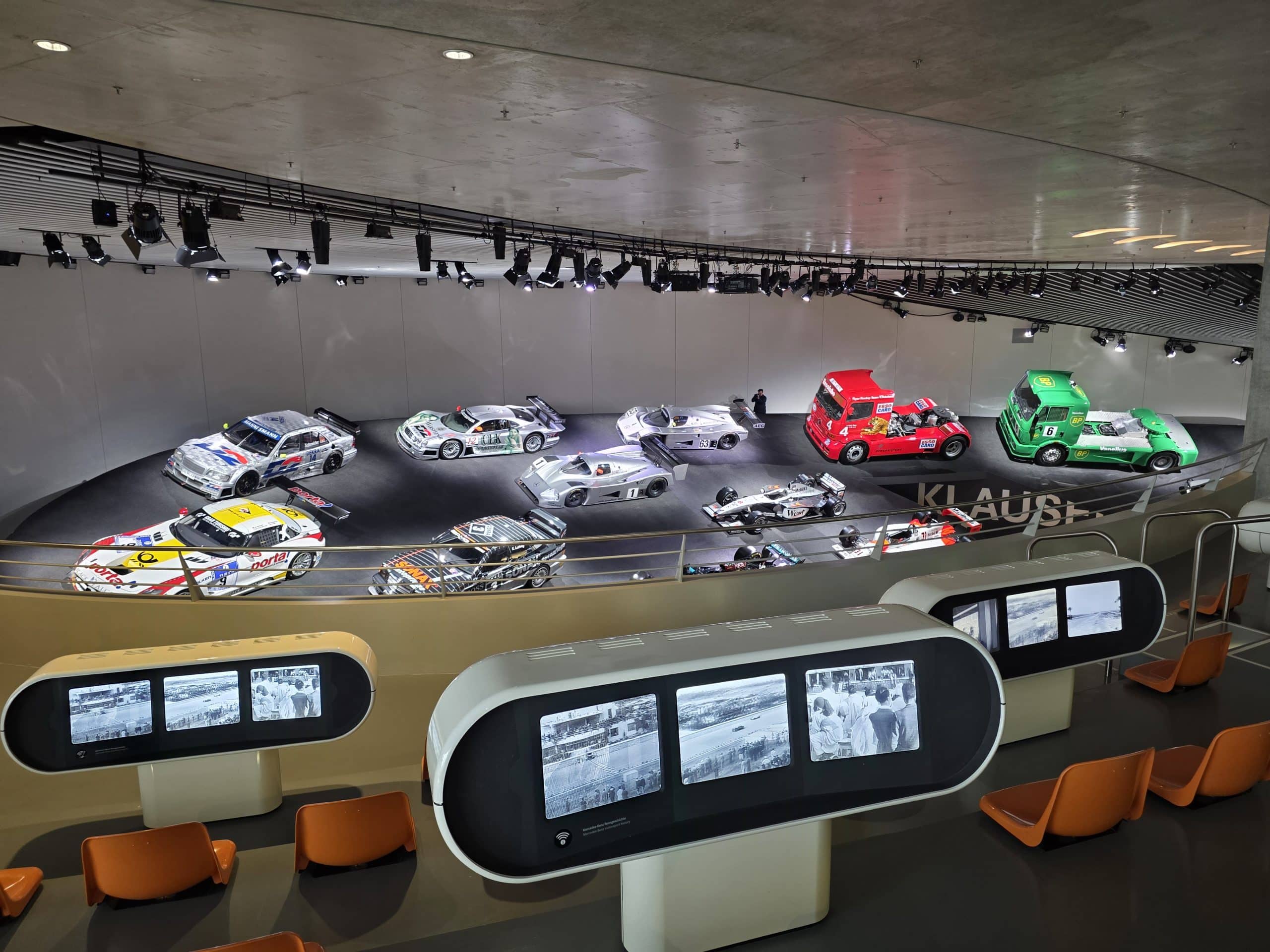 Μόνιμα και εναλλασσόμενα εκθέματα, τοποθετημένα στρατηγικά και χωρίς εμπόδια ή τζάμια καταλήγουν στην αίθουσα της αγωνιστικής κληρονομιάς της Mercedes με τα Silver Arrows. Τα ασημένια βέλη, που δεν οφείλουν το όνομα τους σε μια αισθητική ιδέα και μια ποσότητα μπογιάς, αλλά σε μια έξυπνη ιδέα μείωσης βάρους μέσω αφαίρεσης του χρώματος.