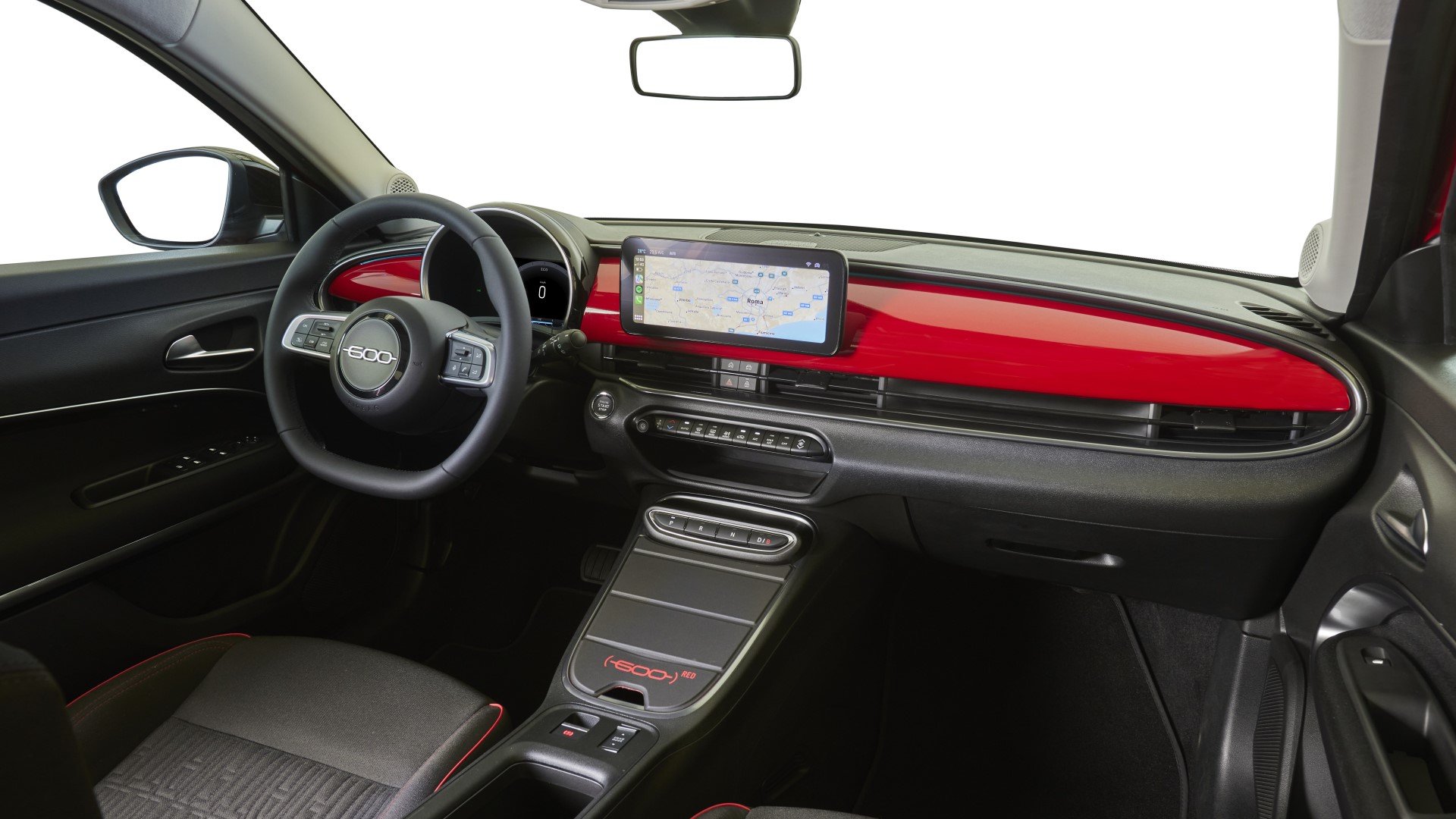 Φυσικά στο κέντρο εδρεύει η ευμεγέθης έγχρωμη οθόνη αφής, μεγέθους 10,25 ιντσών. Αυτή αναλαμβάνει να προβάλλει τις πληροφορίες του συστήματος infotainment Uconnect της Fiat, με ιδιαίτερα ευδιάκριτο τρόπο. Ειδικότερα, υποστηρίζει λειτουργία φωνητικών εντολών, σύστημα πλοήγησης TomTom, εμφανίζοντας παράλληλα τους διαθέσιμους σταθμούς φόρτισης.