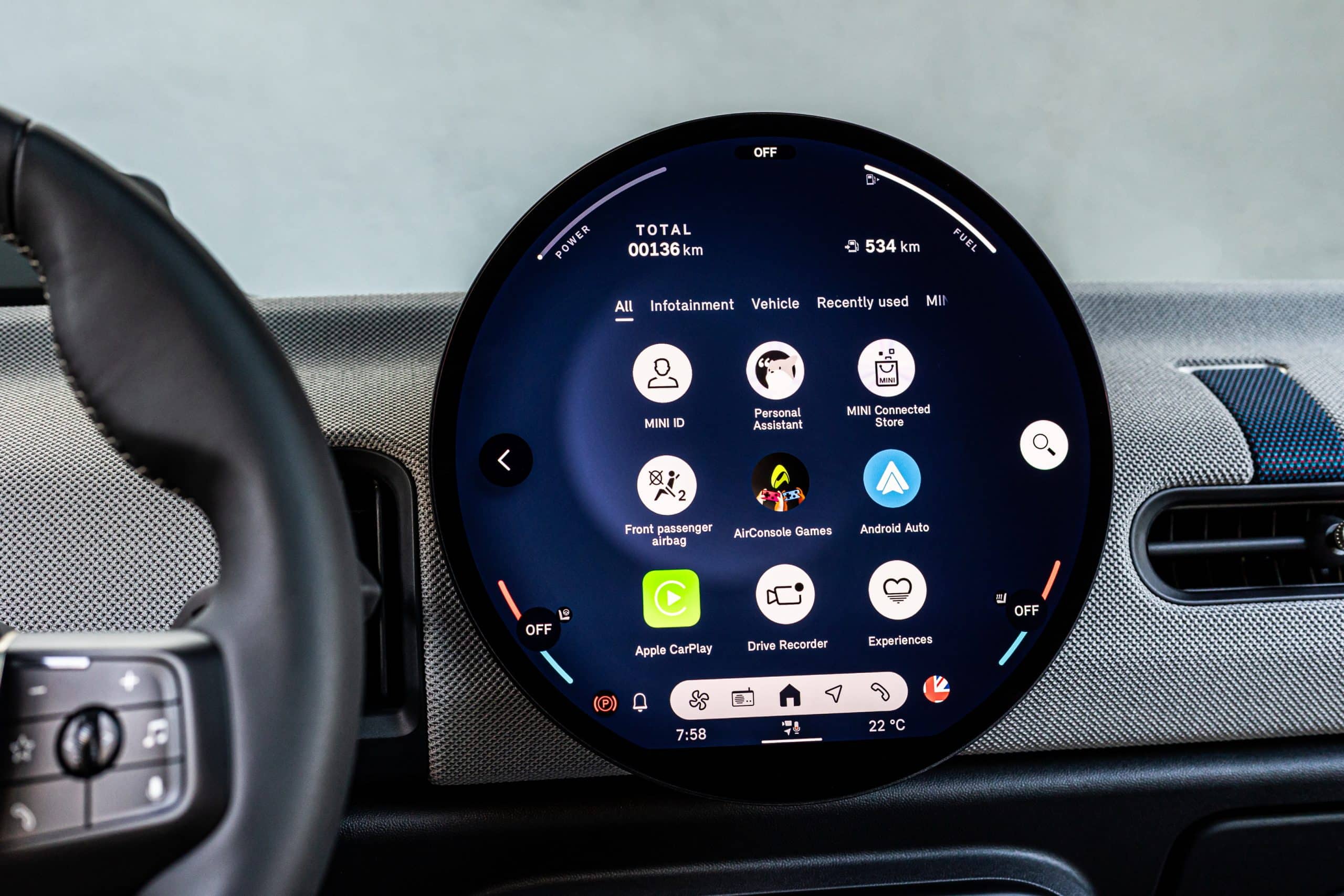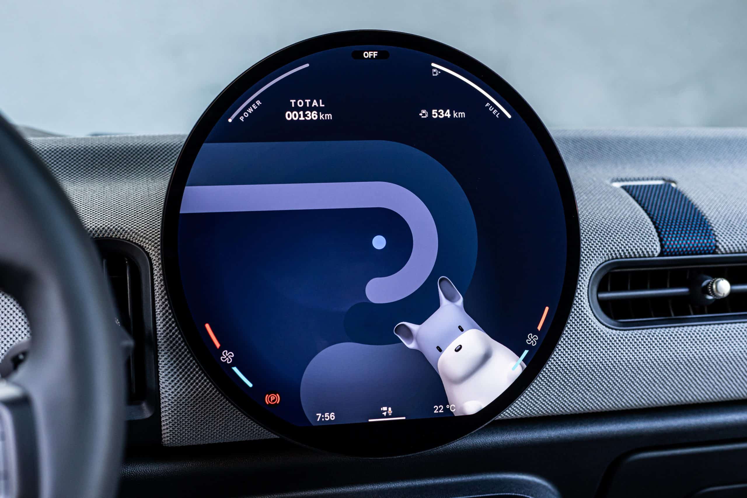 Οι σχετικές με το όχημα πληροφορίες, όπως η ταχύτητα και η κατανάλωση καυσίμου, εμφανίζονται στο επάνω μέρος της οθόνης. Στο κύριο μενού, οι λειτουργίες είναι οριζόντια ως widgets και τις επιλέγουμε με swipe και πατώντας το σχετικό εικονίδιο. Στο κάτω τμήμα της οθόνης τα στοιχεία του μενού «Πλοήγηση», «Μέσα ενημέρωσης», «Τηλέφωνο» και «Κλιματισμός» είναι έτοιμα για επιλογή απευθείας ανά πάσα στιγμή.