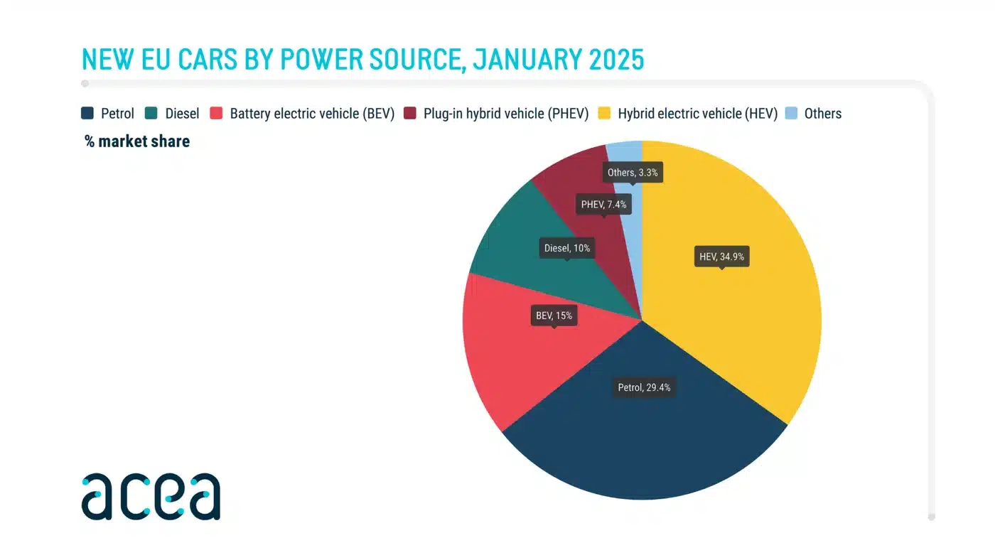 Συνολικά, η αγορά επιβατικών αυτοκινήτων στην ΕΕ μειώθηκε ελαφρά τον Ιανουάριο (-2,6%). Εκτός από τα BEV, τα υβριδικά αυτοκίνητα (HEV) σημείωσαν αύξηση 18%, καταλαμβάνοντας ποσοστό 34,9% της αγοράς, ενώ τα βενζινοκίνητα (29,4%) και τα ντίζελ (10%) μειώθηκαν. Τα υβριδικά plug-in (PHEV) έχασαν έδαφος (-8,5%), καταλαμβάνοντας ποσοστό 7,4%, ενώ τα «άλλα» οχήματα αντιπροσώπευσαν το 3,3%.