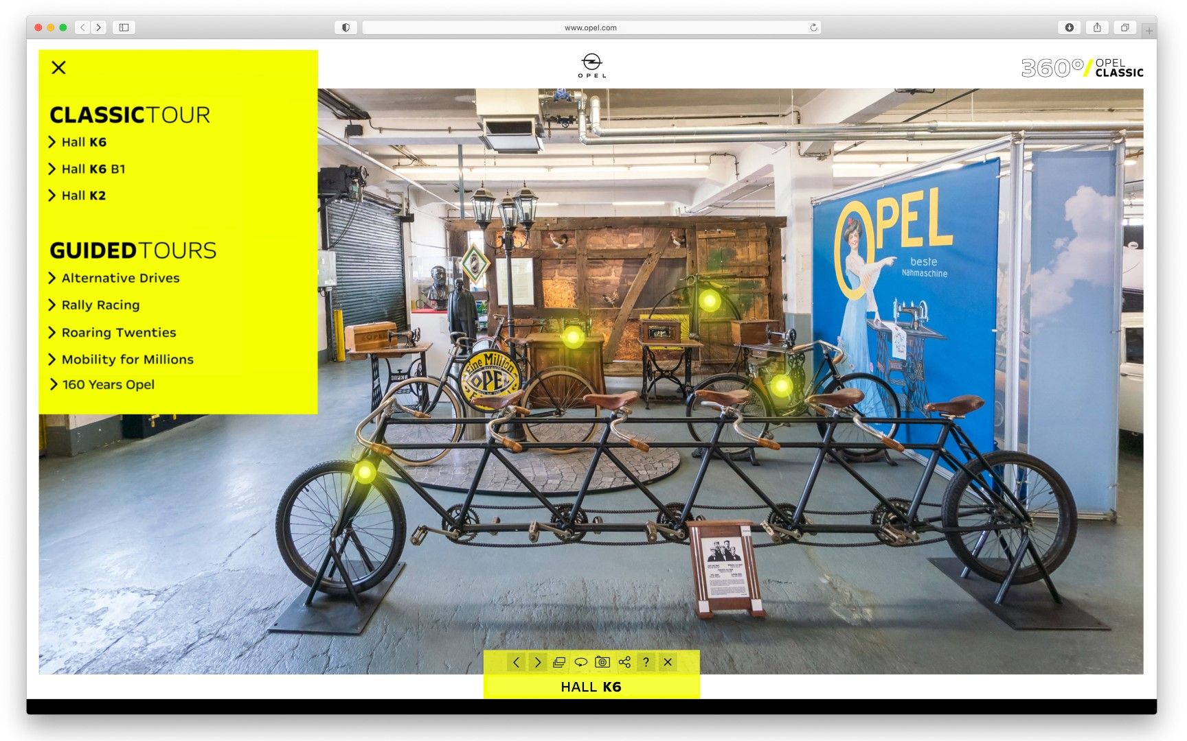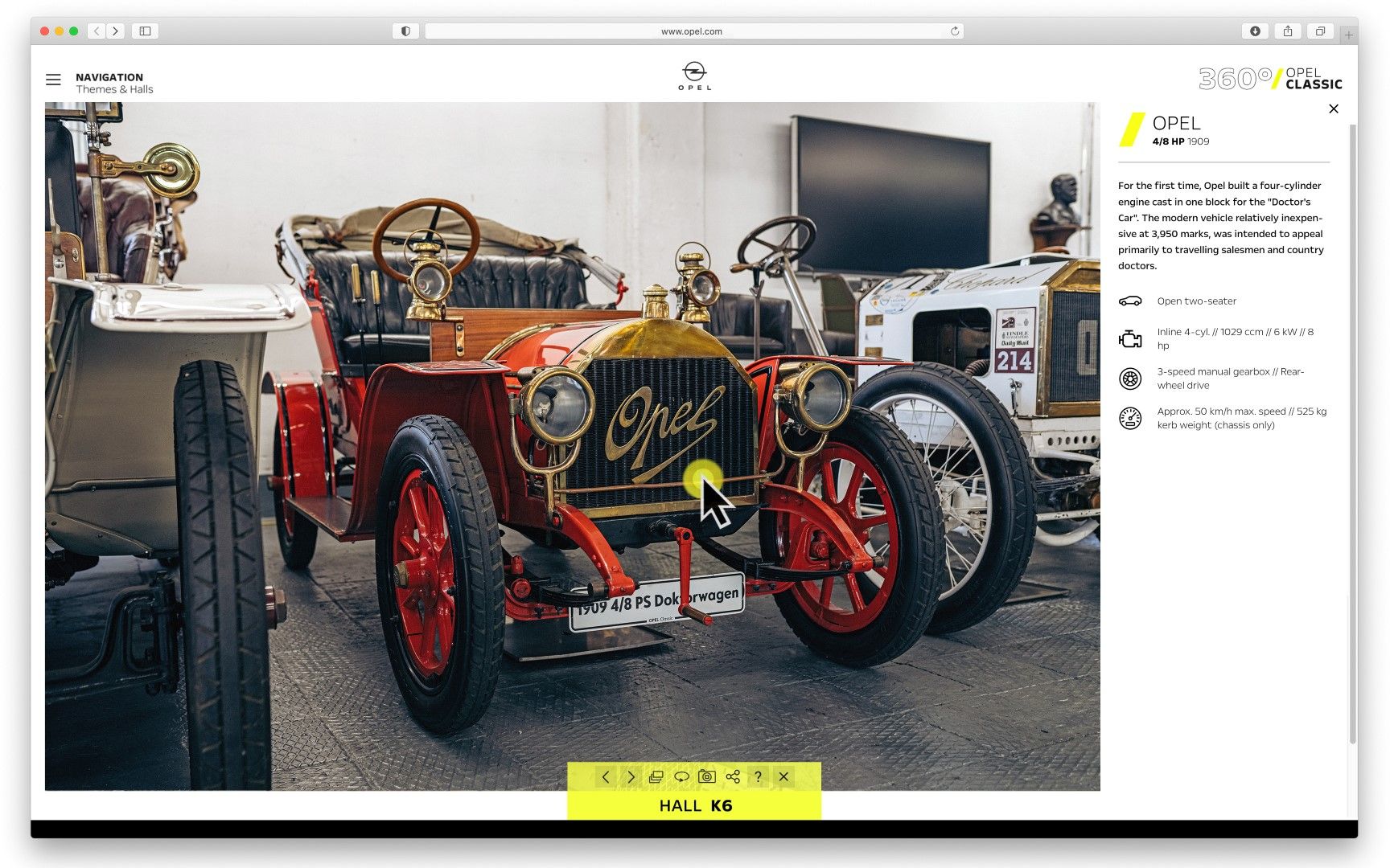 Η νέα περιήγηση 360o μεταφέρει τους επισκέπτες εικονικά στις «ιερές αίθουσες» της Opel Classic Collection στο Rüsselsheim. Εκεί, η Opel στεγάζει έναν πραγματικό θησαυρό από 600 ιστορικά οχήματα. Ακόμη, εδώ θα δούμε 300 επιπλέον εκθέματα, από ραπτομηχανές μέχρι κινητήρες αεροσκαφών της Opel.