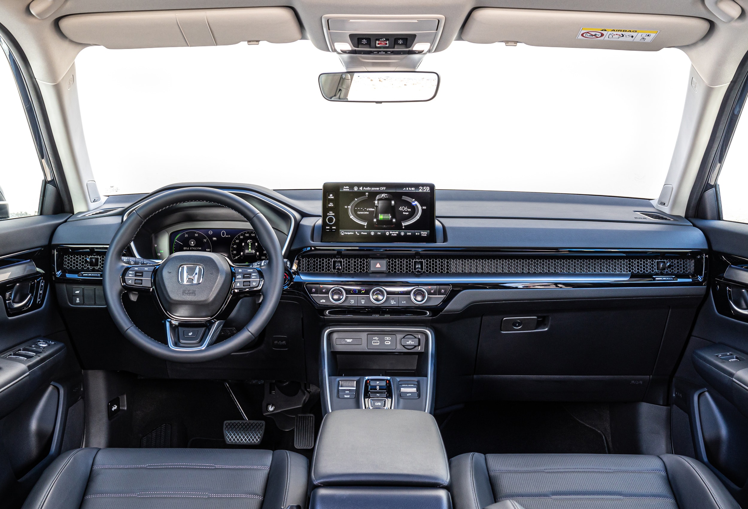 Υλικά υψηλής ποιότητας κατακλύζουν την καμπίνα του νέου CR-V. Φυσικοί διακόπτες και χειριστήρια εύκολα στην κατανόηση και τη χρήση, δημιουργούν μια premium εμπειρία. Ο χειρισμός του infotainment γίνεται μέσω της οθόνης 9 ιντσών στο μέσο του ταμπλό. Ενώ μια δεύτερη οθόνη αντικαθιστά τον αναλογικό πίνακα οργάνων πίσω από το τιμόνι. Πολλές είναι οι επιλογές εξατομίκευσης στιλιστικών στοιχείων και χρωμάτων στο εσωτερικό του αυτοκινήτου. Τα καθίσματα από μαύρο γνήσιο δέρμα, με έντονες καπιτονέ λεπτομέρειες είναι θερμαινόμενα για τους εμπρός επιβάτες και στάνταρ αεριζόμενα στην έκδοση Advance, βελτιώνοντας την άνεση στα μακρινά ταξίδια.