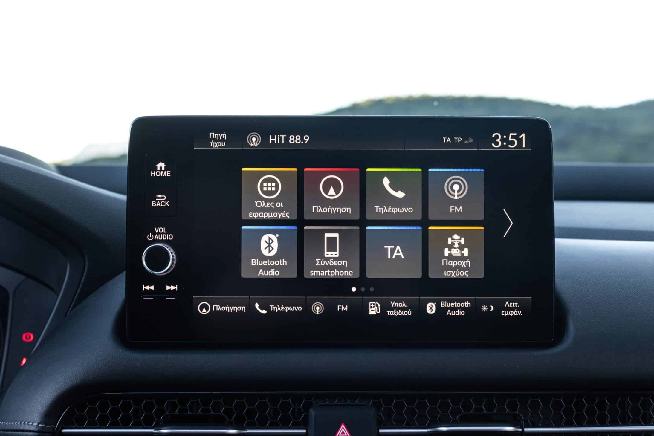 Μια οθόνη αφής εννέα ιντσών στην κορυφή του ταμπλό παρέχει πληροφορίες και συνδέεται με mirroring στο smartphone μέσω των Apple CarPlay και του Android Auto. Επιπλέον οι εκδόσεις Advance έχουν νέο head-up display πέντε ιντσών για να προβάλλει στο εσωτερικό του παρμπρίζ πληροφορίες όπως η ταχύτητα, η πλοήγηση, οι λειτουργίες του Honda SENSING και οι εισερχόμενες κλήσεις. Αδιάλειπτη συνδεσιμότητα υπάρχει για όλους τους επιβάτες, αφού το ZR-V έχει πέντε θύρες φόρτισης και επιφάνεια ασύρματης φόρτισης 15 Watt για smartphones.