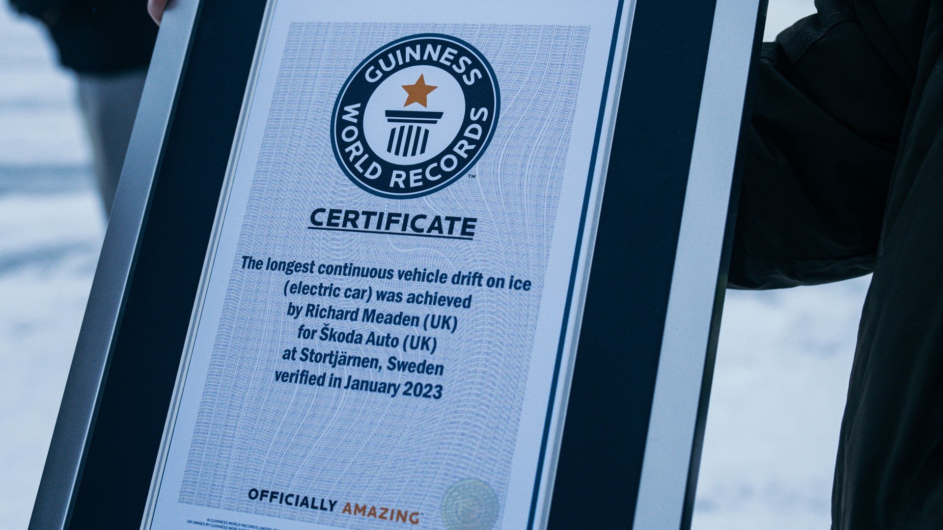 Όπως είναι φυσικό, αυτό το επίτευγμα είναι άξιο για καταγραφή στα Παγκόσμια Ρεκόρ Guinness και μάλιστα διπλά. Πιο συγκεκριμένα, το Skoda Enyaq RS iV και ο Meaden σημείωσαν ρεκόρ για την «Μεγαλύτερη συνεχόμενη πλαγιολίσθηση οχήματος στον πάγο» και ταυτόχρονα για τη «Μεγαλύτερη συνεχόμενη πλαγιολίσθηση ηλεκτρικού οχήματος στον πάγο».