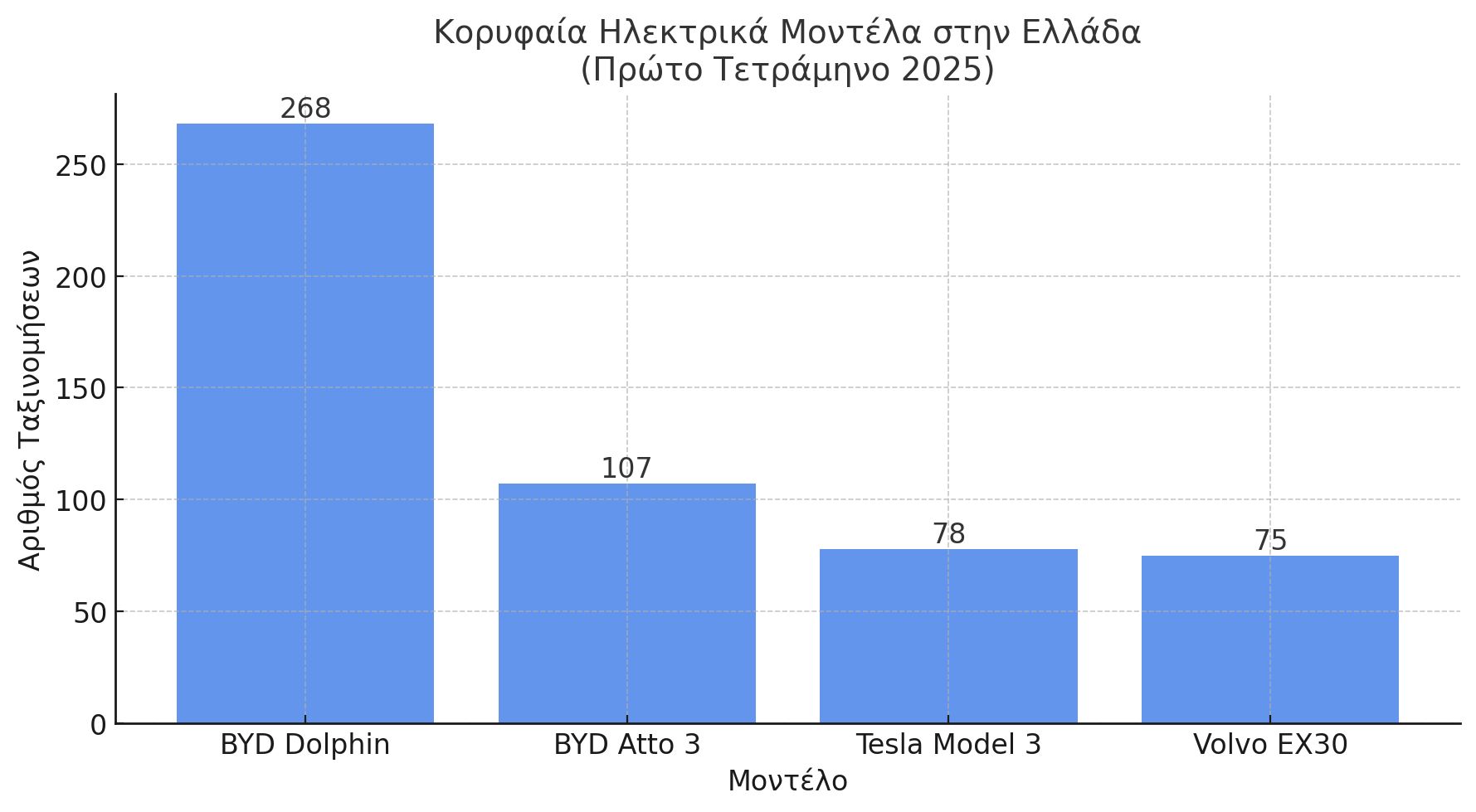 Στην κορυφή των προτιμήσεων των αγοραστών, βρίσκεται το πεντάθυρο BYD Dolphin, ένα συμπαγές hatchback, που σημείωσε 385 πωλήσεις. Τη δεύτερη θέση καταλαμβάνει το δυναμικό Tesla Model 3, ένα αμιγώς ηλεκτρικό sedan, με 219 πωλήσεις, ενώ στην τρίτη θέση αναρριχήθηκε το EX30, το μικρών διαστάσεων SUV της Volvo, με 172 μονάδες. Το ATTO 3 της BYD, επίσης SUV, έφτασε στην τέταρτη θέση με 170 πωλήσεις, ενώ την πρώτη πεντάδα, κλείνει το επιβλητικό Tesla Model Y, με 165 πωλήσεις.