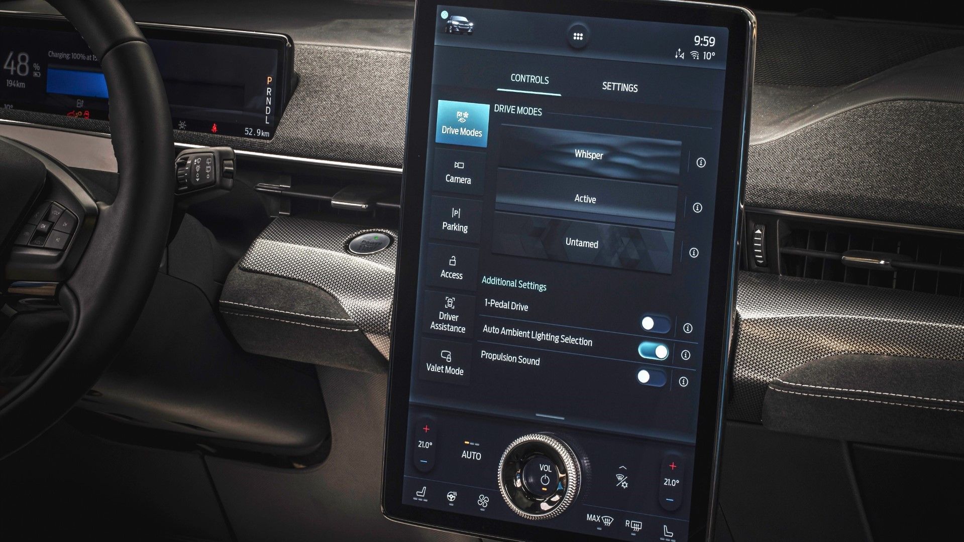 Επιπλέον, η προηγμένη λειτουργία pre-conditioning της νέας Mustang Mach-E, ενεργοποιείται με απλά βήματα, μέσω της οθόνης SYNC 4A, ή μέσω της εφαρμογής FordPass. Αυτή η λειτουργία επιτρέπει στο χρήστη να ορίσει την επιθυμητή θερμοκρασία στην καμπίνα, ενώ το όχημα φορτίζει. Προφανώς, με αυτόν το τρόπο, ο κλιματισμός δεν αντλεί ενέργεια από την μπαταρία, ώστε να επιβαρύνει την αυτονομία.