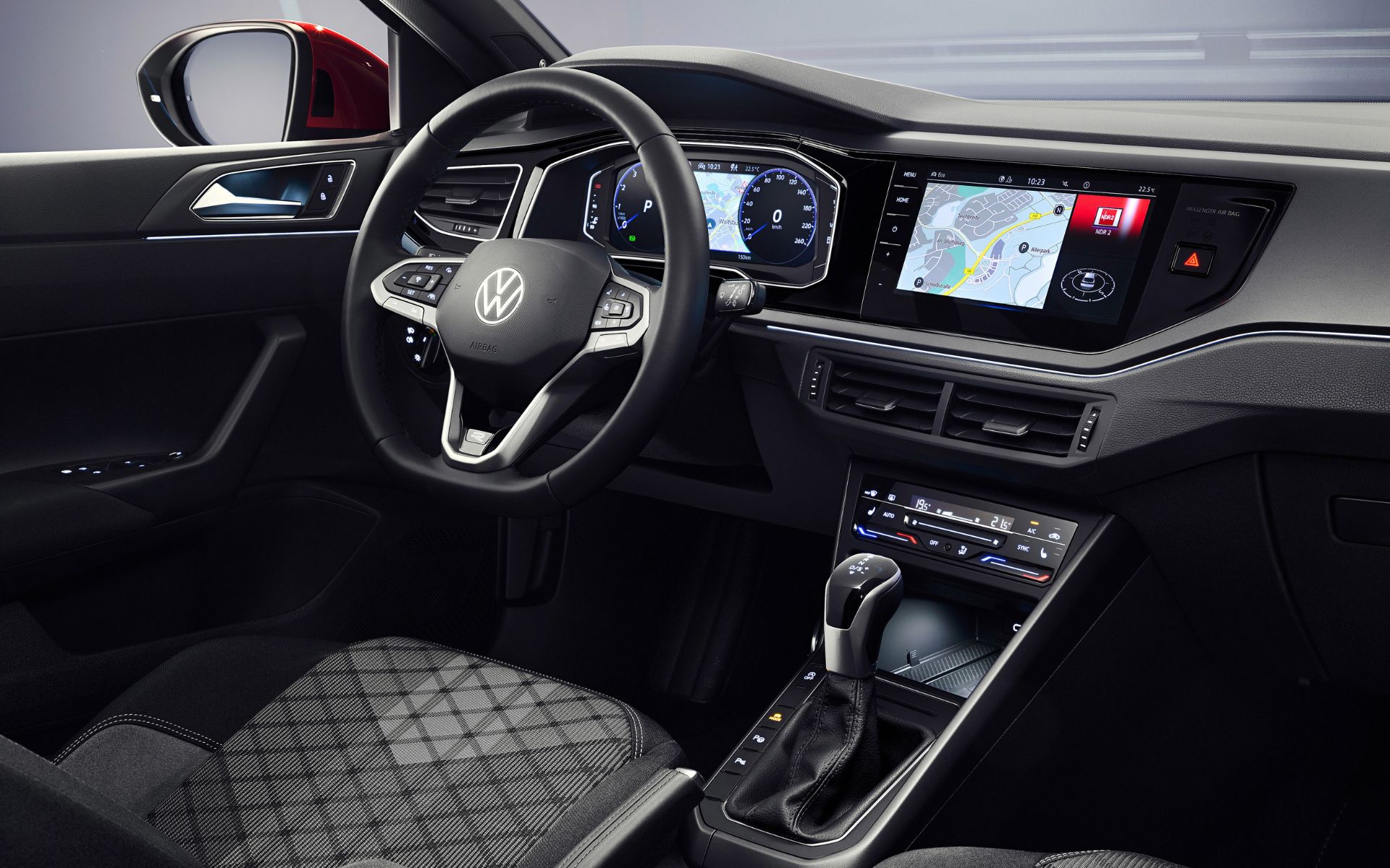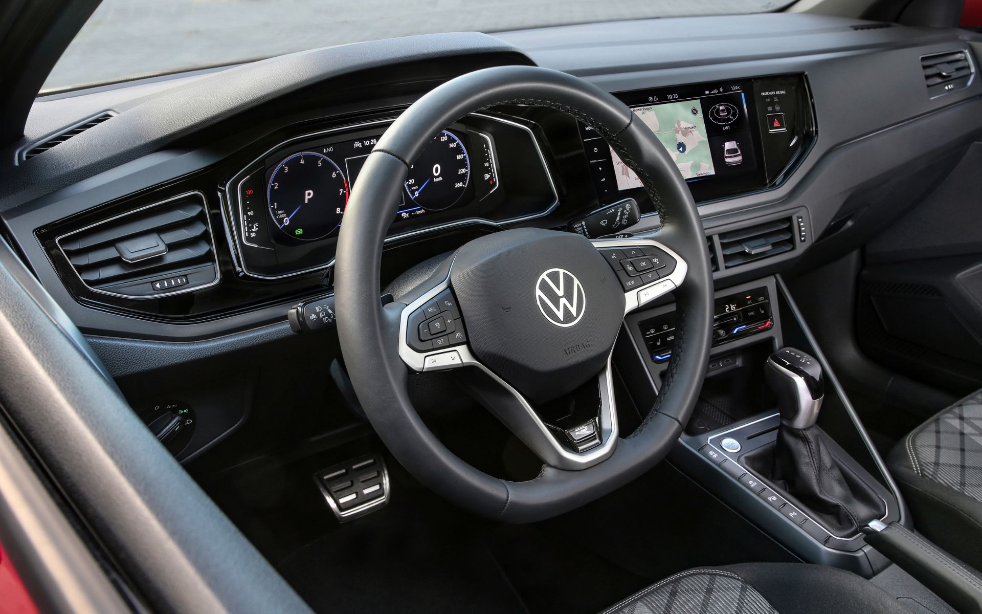Από την πρώτη επαφή με την καμπίνα του Volkswagen Taigo είναι αντιληπτοί οι κοινοί δεσμοί του με το Polo. Ο ψηφιακός πίνακας οργάνων και η οθόνη αφής του infotainment γεμίζουν το οπτικό πεδίο του οδηγού. Το ταμπλό είναι κατασκευασμένο από ποιοτικά υλικά, ενώ και η συναρμογή είναι πολύ καλή.