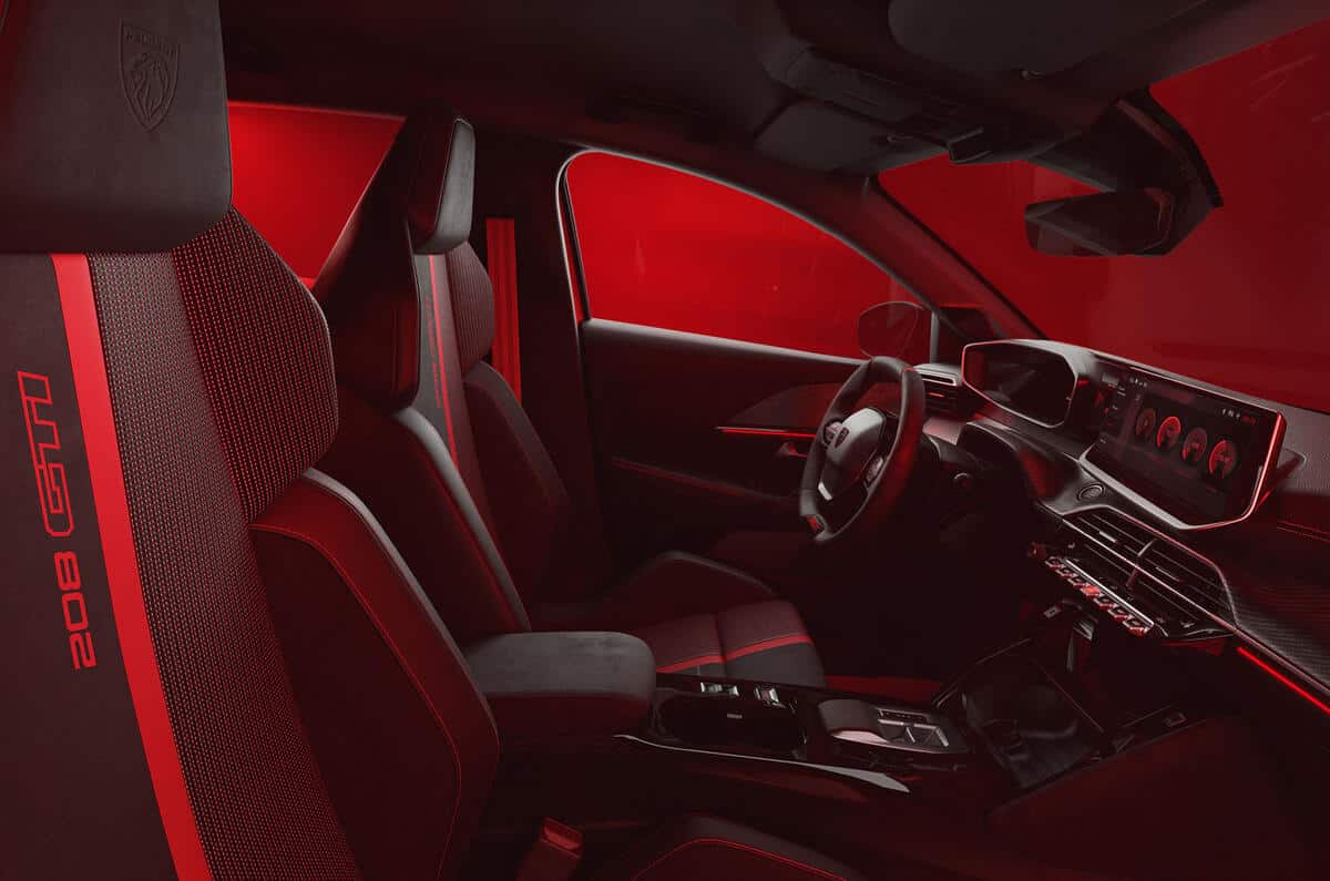 Στο εσωτερικό, οι ρετρό αναφορές συνεχίζονται: μπάκετ καθίσματα σε κόκκινο-μαύρο συνδυασμό, κόκκινα πατάκια και επένδυση Alcantara στο τιμόνι και τα καθίσματα, δίνουν μία σπορ αλλά εκλεπτυσμένη αίσθηση. Κατά τα λοιπά, η καμπίνα παραμένει ίδια με το βασικό e-208.