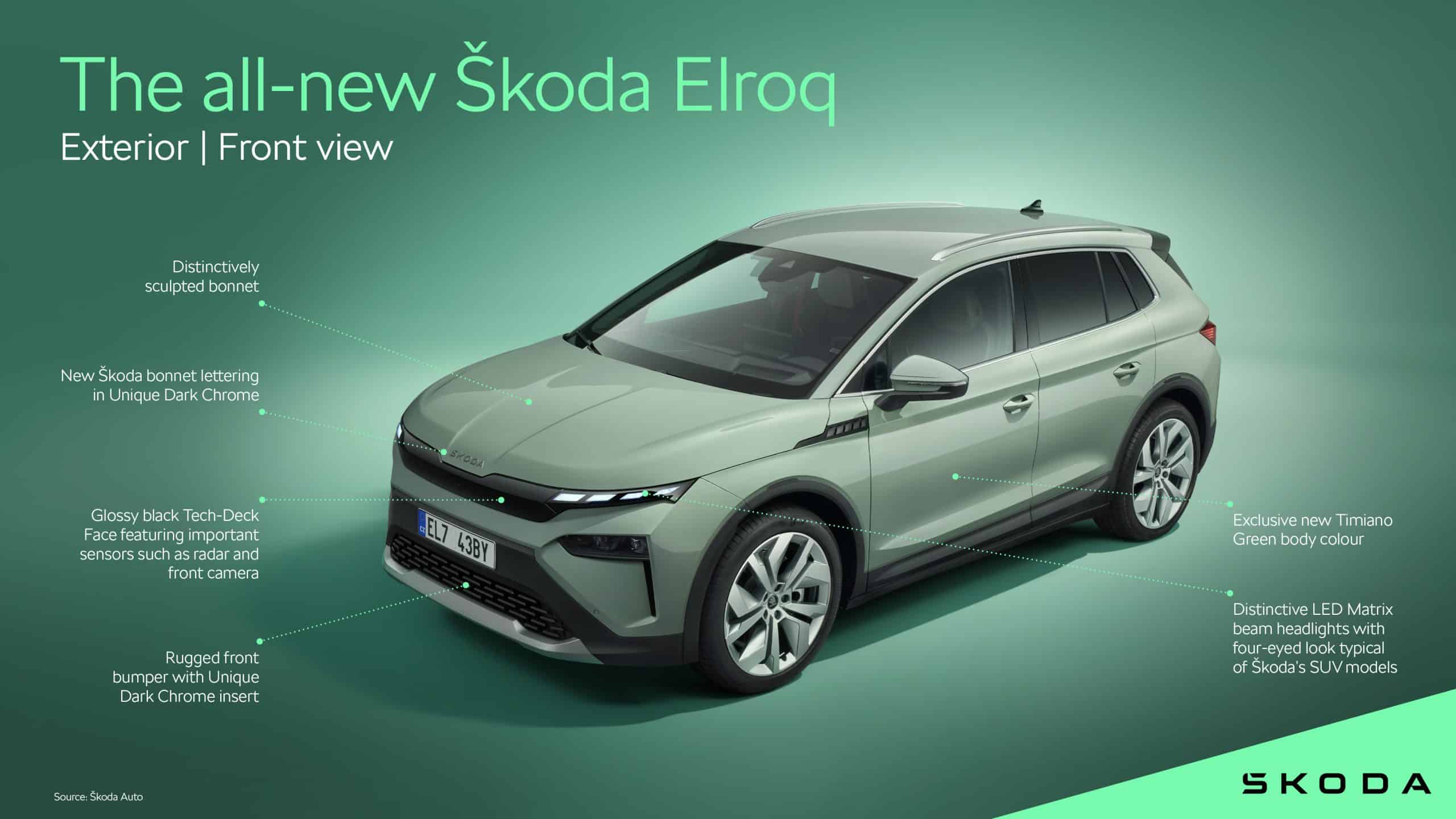 Βασικό χαρακτηριστικό της νέας σχεδιαστικής γλώσσας Modern Solid που καθορίζει το μπροστινό μέρος του Elroq είναι το γυαλιστερό μαύρο Tech-Deck Face, το οποίο αντικαθιστά την κλασική μάσκα. Πάνω από αυτό υπάρχει η επιγραφή Skoda στο καπό, σε Unique Dark Chrome – άλλο ένα στοιχείο της νέας σχεδιαστικής γλώσσας. Οι λεπτοί προβολείς επανερμηνεύουν την τυπική τετραπλή όψη των SUV της Skoda. Ανάλογα με το επίπεδο εξοπλισμού, μια νέα φωτεινή λωρίδα συνδέει τους κύριους προβολείς LED, με τις κορυφαίες εκδόσεις να εξοπλίζονται με προβολείς LED Matrix. Τα πίσω φωτιστικά σώματα ακολουθούν επίσης τις αρχές Modern Solid. Η νέα σχεδίαση επιτυγχάνει και εξαιρετική αεροδυναμική, με συντελεστή οπισθέλκουσας (cd) μόλις 0,26.