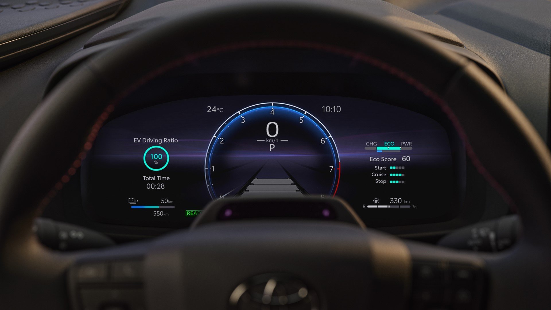 Μπαίνοντας στην καμπίνα του νέου Toyota C-HR, αντικρίζεις ένα σύγχρονο εσωτερικό, με υψηλά επίπεδα τεχνολογίας. Αρχικά, ο ψηφιακός πίνακας οργάνων των 12,3 ιντσών είναι υψηλής ανάλυσης, προβάλλοντας πληροφορίες ξεκάθαρα χωροθετημένες και ευανάγνωστες. Μάλιστα, με ανάλογη ρύθμιση, η οθόνη μπορεί προβάλλει περιεχόμενο ανάλογα με τις προτιμήσεις του οδηγού. Υπάρχουν 3 προκαθορισμένες διατάξεις, οι οποίες αλλάζουν μέσω διακοπτών στο τιμόνι.