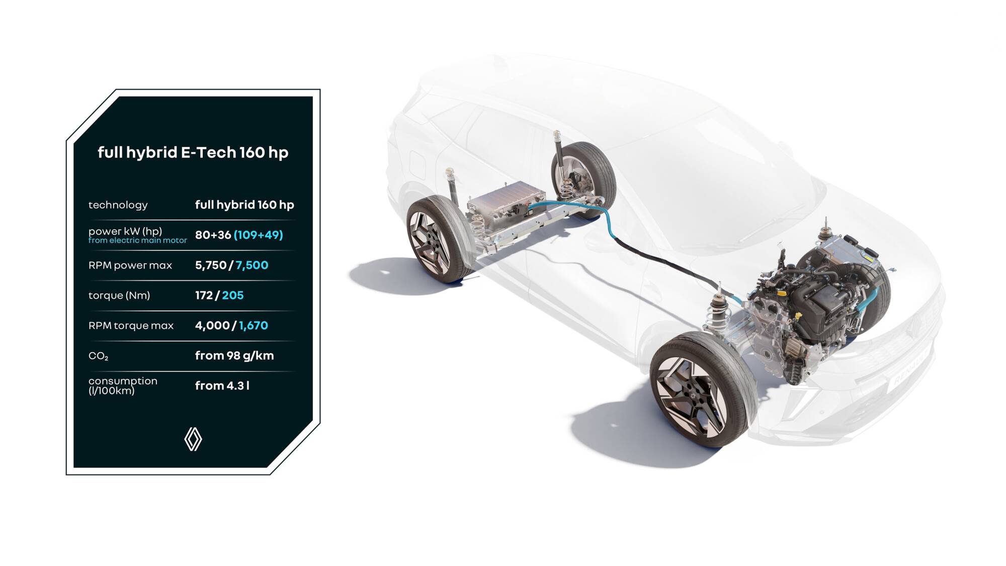 Πιο συγκεκριμένα, σε σχέση με το σύστημα κίνησης full hybrid E-Τech 145 ίππων, η ροπή είναι αυξημένη κατά 25%, αλλά και διαθέσιμη σε χαμηλότερες στροφές (περίπου 2.000σ.α.λ.), για καλύτερες επιδόσεις και απόκριση. Αναλόγως βελτιωμένες είναι και οι επιδόσεις, με το 0-100 km/h να ολοκληρώνεται σε 8,9 δευτερόλεπτα (σχεδόν 2δλ. πιο γρήγορα από ότι με το προηγούμενο σύνολο E-Tech).