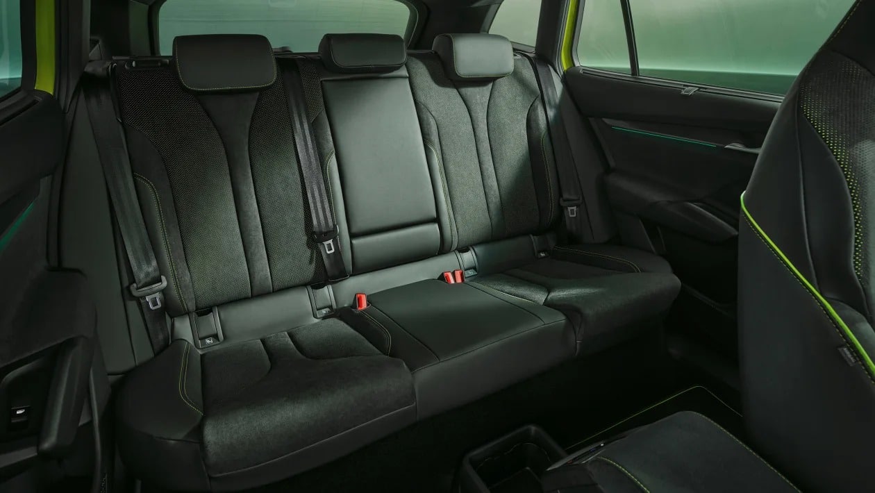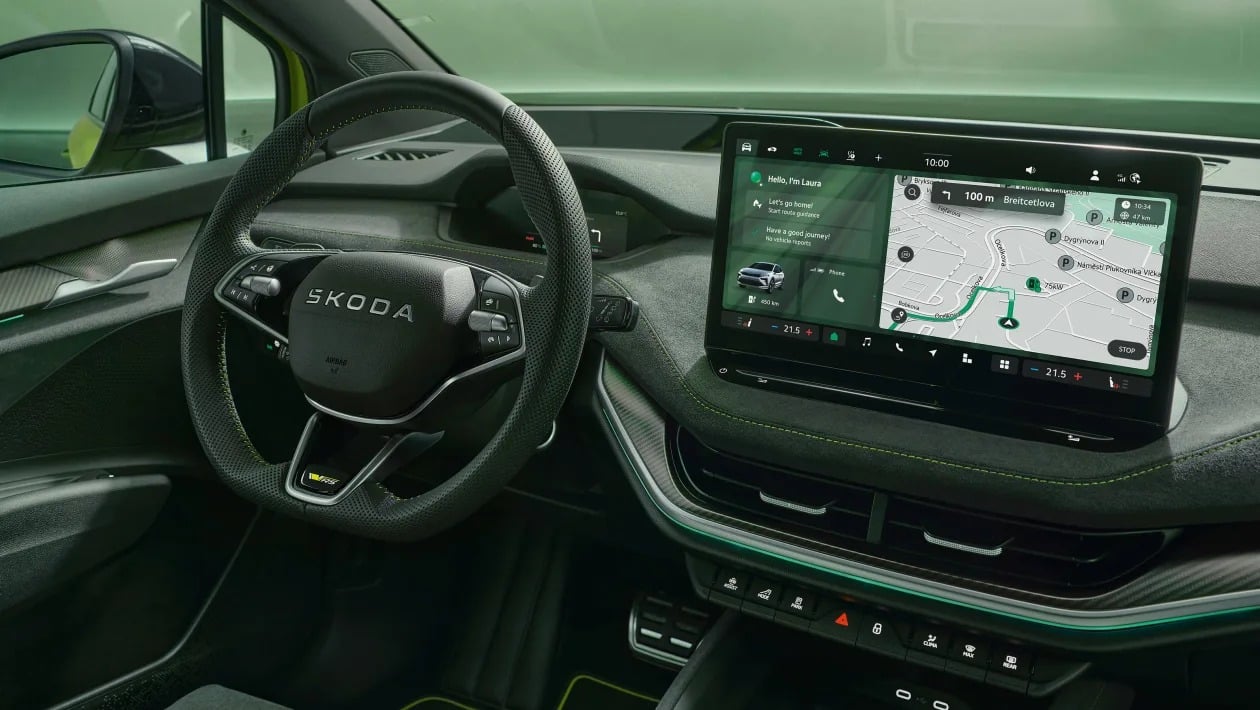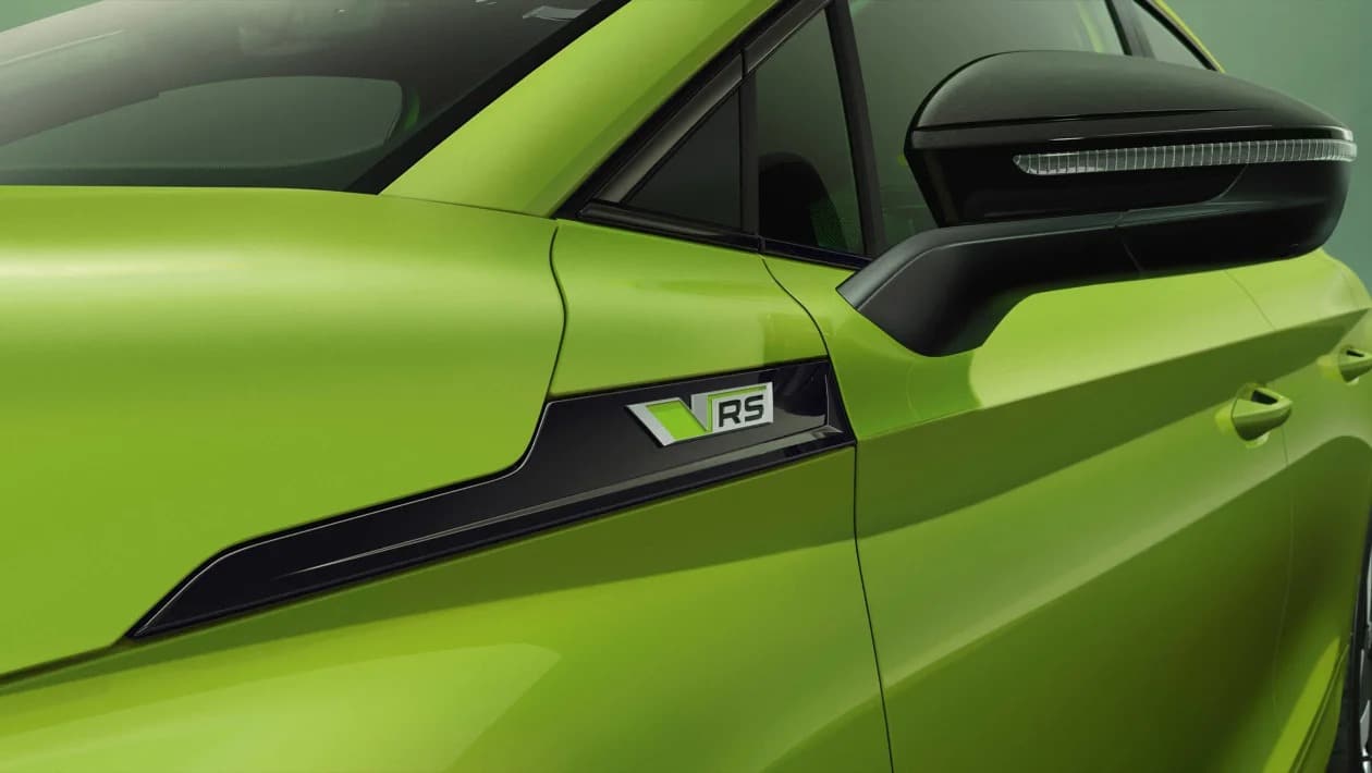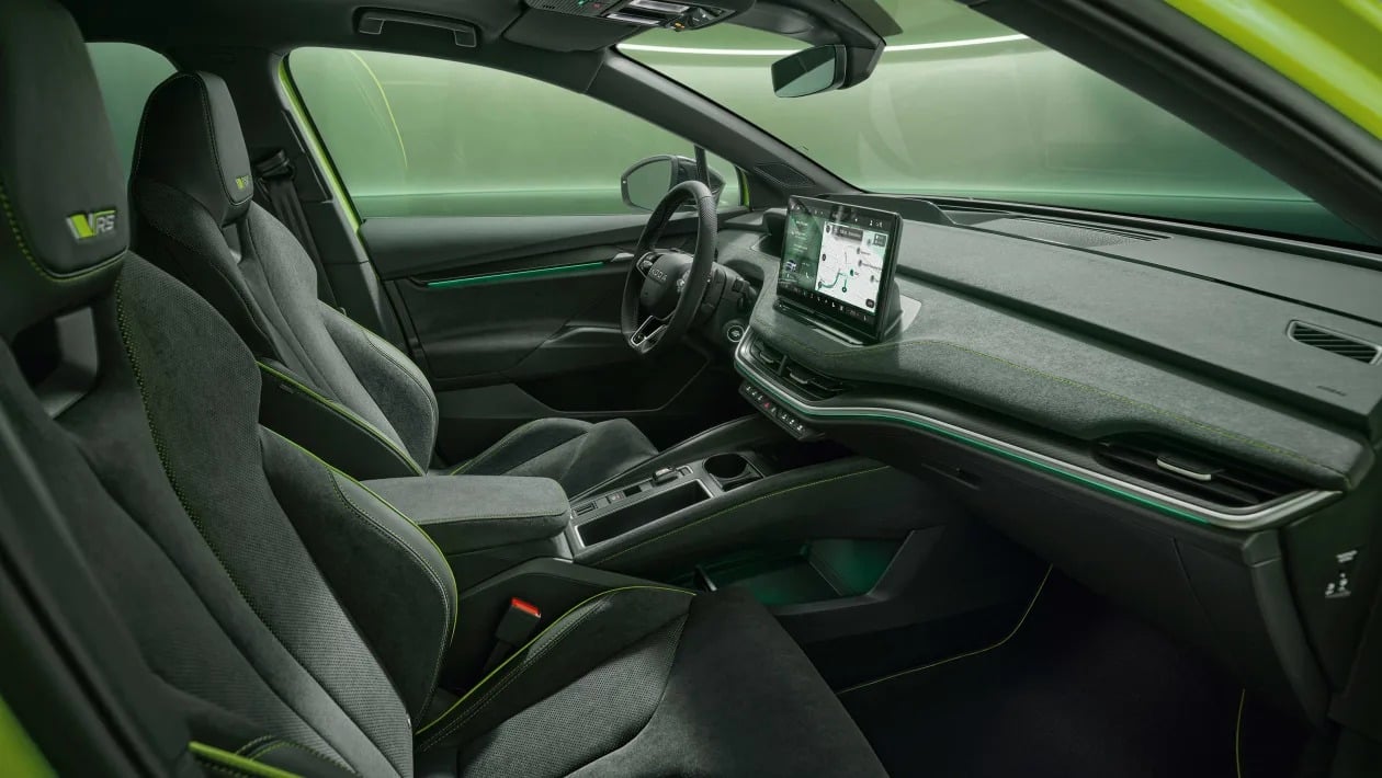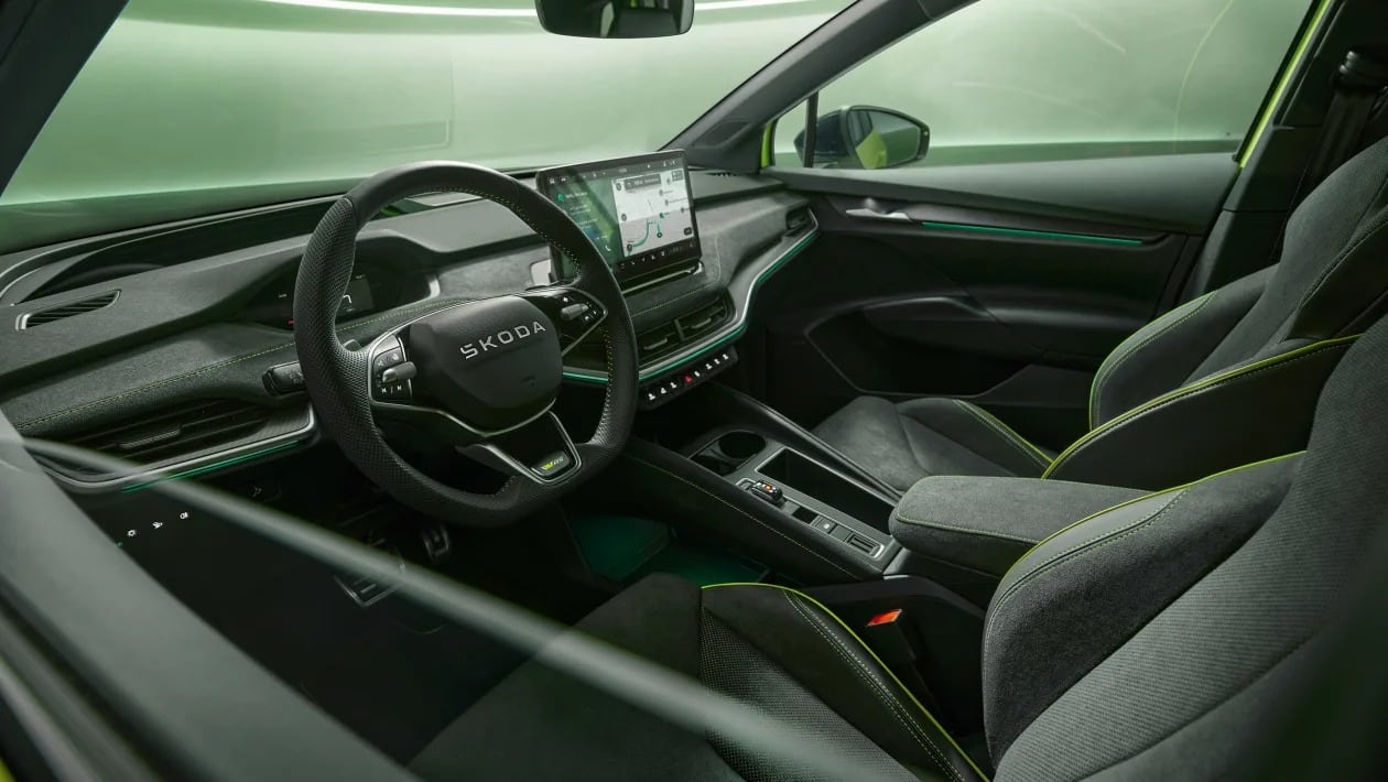 Οι δύο επιλογές εσωτερικού, vRS Suite και Lounge, προσφέρουν υλικά premium ποιότητας με τεχνητό δέρμα, microsuede και λεπτομέρειες σε πράσινο lime. Παρότι εξωτερικά διαφέρουν ελάχιστα από τα Elroq, το Enyaq vRS εντυπωσιάζει με τις επιδόσεις του: 0-100 χλμ,/ώρα σε μόλις 5,4 δευτερόλεπτα και τελική ταχύτητα 180 χλμ./ώρα.